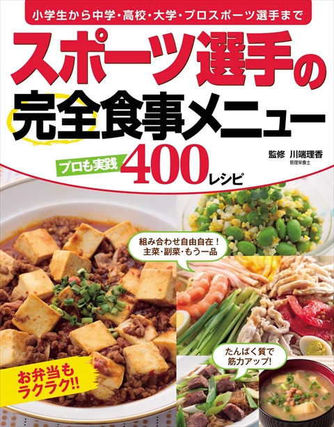 小学生から中学・高校・大学・プロスポーツ選手まで幅広い層のスポーツに取り組む方々のために、朝昼晩、いつ、どんなものを食べたらよいのか、効果的な食事の仕方や栄養満点のレシピ400点を紹介しました。監修は数多くのプロスポーツ選手を指導している川端理香氏。組み合わせ自由自在の主菜・副菜・もう一品の献立付きです。