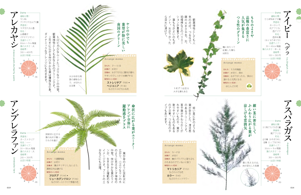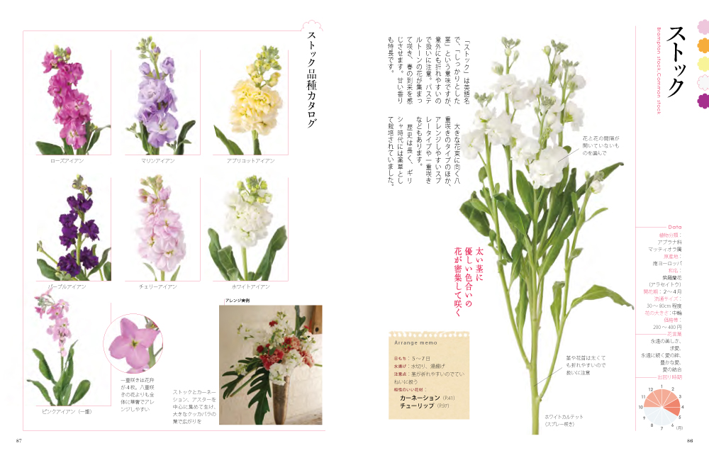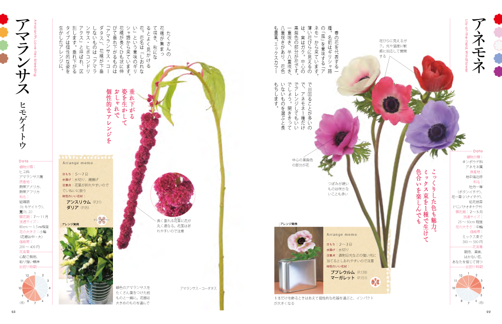四季折々、花屋さんに並ぶ人気の花・枝もの・実もの・グリーンを集めて五十音順に紹介しています。美しい写真とともに、花色や原産地などの基本データほのか、出回り時期や水揚げ方法などの実用情報も充実。フラワーアレンジや生け花はもちろん、花をモチーフにした手芸やイラストの作品作りにも役立てていただけます。