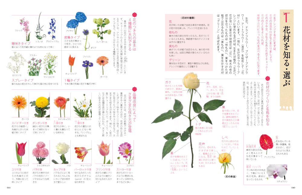 はじめにこの本の使い方花編枝もの編実もの編グリーン編花とアレンジの基礎知識付録 色別・季節別・シーン別・おすすめの花材一覧