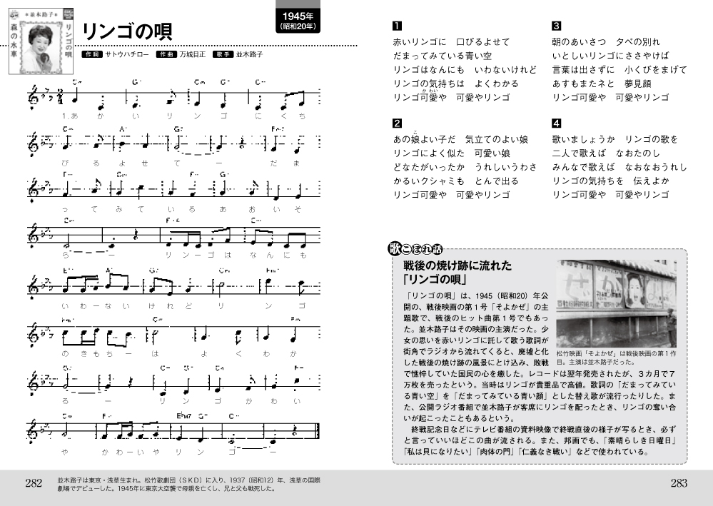誰もがよく耳にし歌った、なつかしの童謡・唱歌・戦後の歌謡曲・フォークソング・ニューミュージックなど、心に響く名曲228曲を集めました。CDには20曲を収録。楽譜にはコードが付いていますので、一人でしみじみ歌うもよし、ギターやピアノにあわせてみんなで歌うもよし。時代背景や曲についてのエピソードなどのミニ情報のほか、歌謡曲・フォークソング・ニューミュージックにはレコードジャケットも掲載しました。