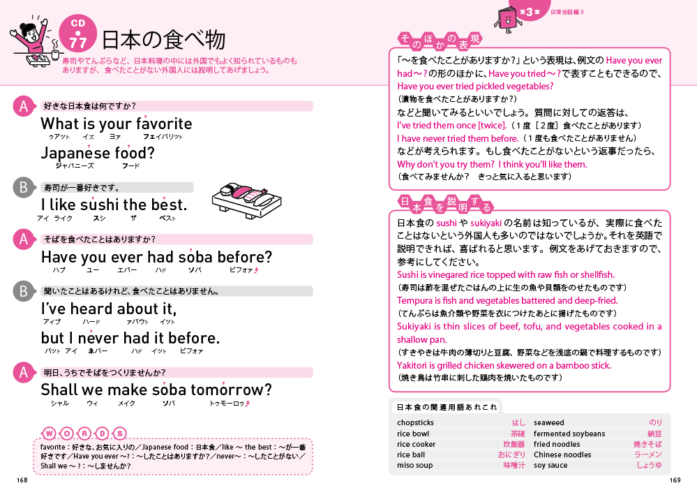 実際に使える英会話をラクに学びたい!こんな希望を実現するのがこの本とCDです。日常生活でのいろいろな場面を考え、そこでよく使われそうな表現をコンパクトにまとめてあります。また、話がはずむきっかけになるような言い方などをたくさん紹介し、使用頻度の高い単語やテーマに合わせた関連用語をその都度ピックアップしてあります。さらに、CDでは、ネイティブの発音やイントネーションを、スロー・通常の2段階再生で学ぶことができます。