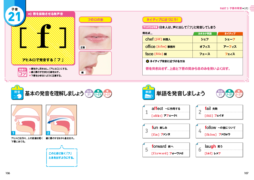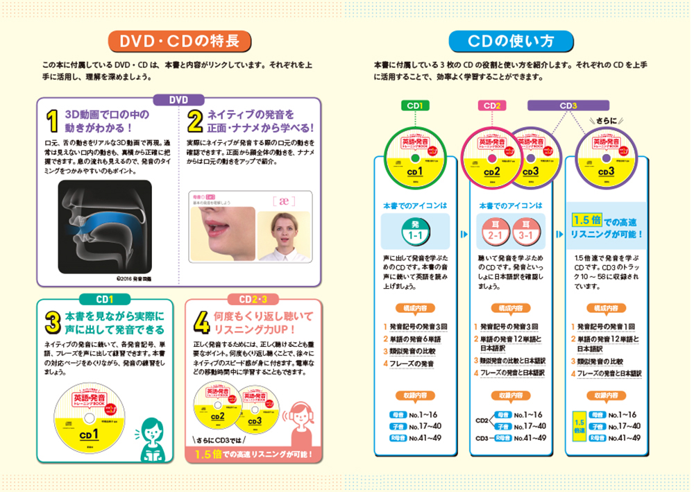 「DVDの特長」?@3Dアニメーションで、「口の中」の動かし方がハッキリわかる!?Aネイティブの口の動かし方を映像で学べる! 「CDの特長」実際に声を出して発音するCDが1枚。電車など移動中に繰り返し聴いて覚えるCDが2枚!