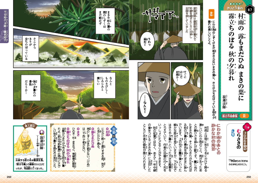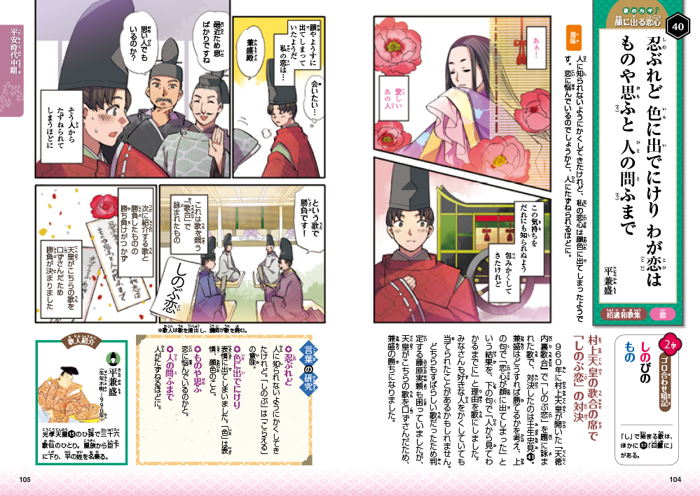 本書では、「 百人一首」のすべての和歌の意味をステキなまんがで説明しています。「 百人一首」を知ると、美しい言葉や、独特なリズムに魅了されることでしょう。