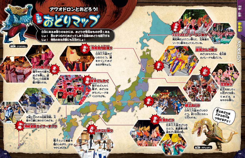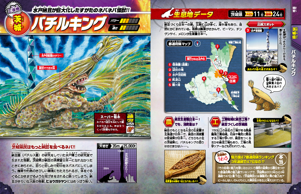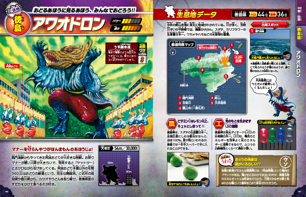 「ご当地の魅力をもっと知ってもらいたい!」ということで、都道府県の特徴を表す個性豊かな怪獣たちがご当地をわかりやすく紹介! 都道府県の形や位置、産業・歴史が楽しく学べます!