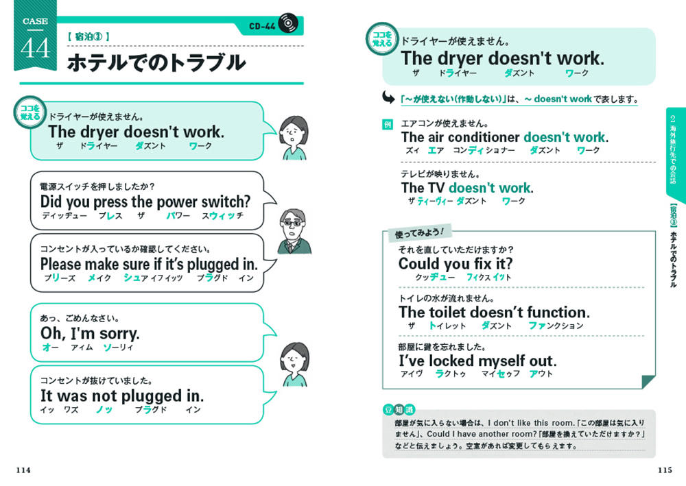 フレーズはできるだけ短い英語で紹介しているので、英会話初心者でも安心です。