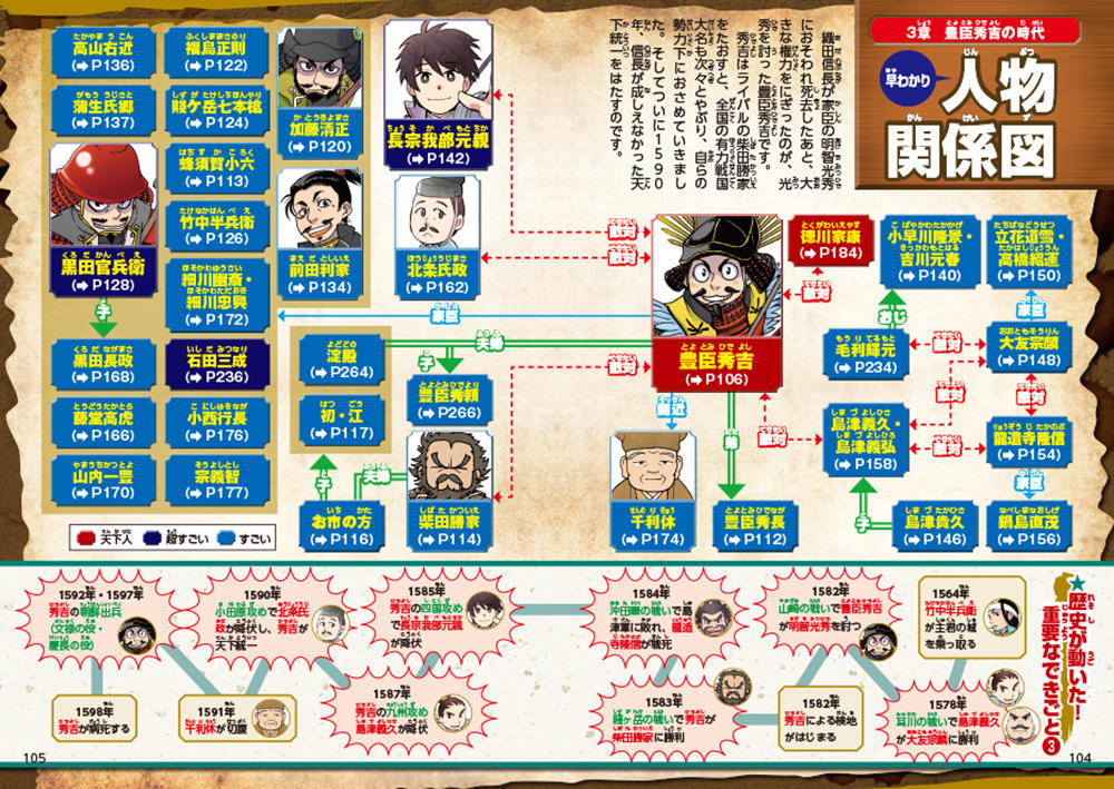 戦国時代を生き抜いた105人がオールカラーのまんがで楽しく学べます。武将の生きざまを知れば、歴史がもっともっと好きになる!夢中になって読めちゃう内容です。