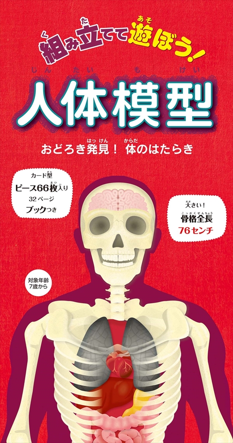 イギリスで大人気のパズルブック『BUILD THE HUMAN BODY』の翻訳本が登場。 66個の人体パーツを組み立てて、高さ76センチの大きなガイコツをつくることができます。この模型を見ながら、からだのことを学ぶことができる1冊です。 32ページ・オールカラーの大判ガイドブックがついているので、人体の仕組みや機能もしっかり学習できます。