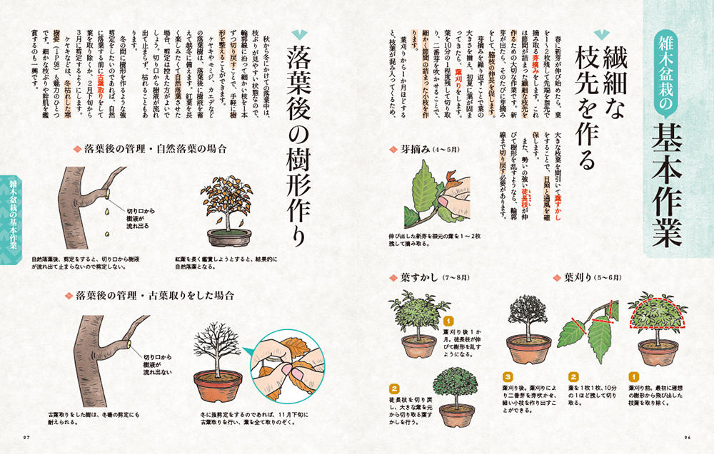 そんな問いかけから、始まる本書は、初心者に向けて、盆栽という「芸術作品」を作るコツを惜しげもなく伝授。本格的な盆栽を実践できる作りになっています。
