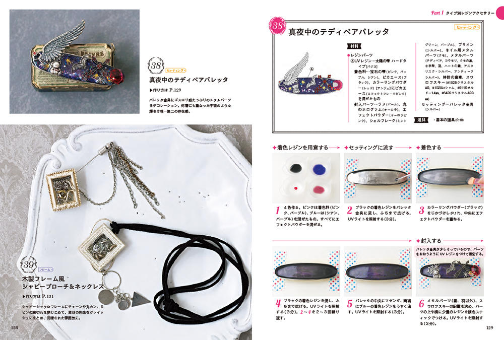 シリーズ人気の秘密である、丁寧で親切な解説も健在。プロセスカットを多数入れ、レジンの使い方や作り方はもちろん、すべての工程をしっかり解説いたします。