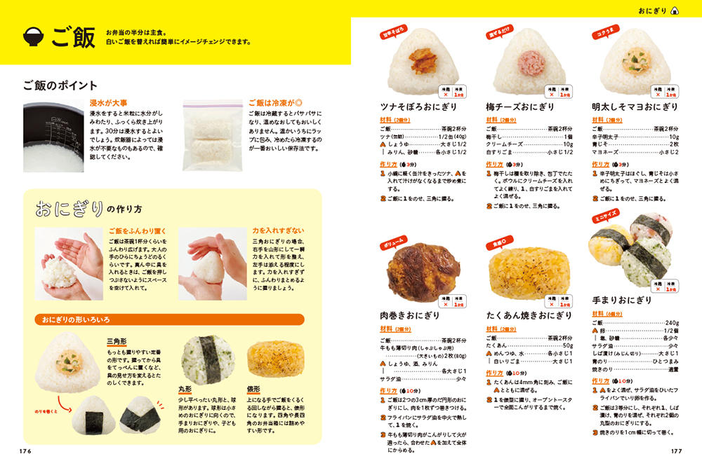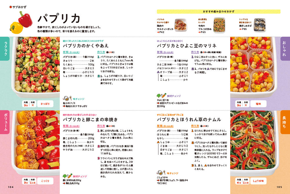 手早くできる「スピード」や「ラクラク」ジャンルのほか、1品でOKな「のっけ弁」、インスタ映えを意識した「おしゃれ」なおかずジャンルもあり、お弁当づくりがもっと簡単に、もっと楽しくなる要素が満載です。また、組み合わせや詰め方のヒントも紹介しています。