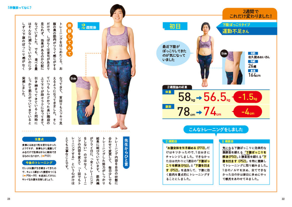 実践モニターの例も掲載し、「思わずやってみたくなる!」新しいお腹痩せトレーニング本です。