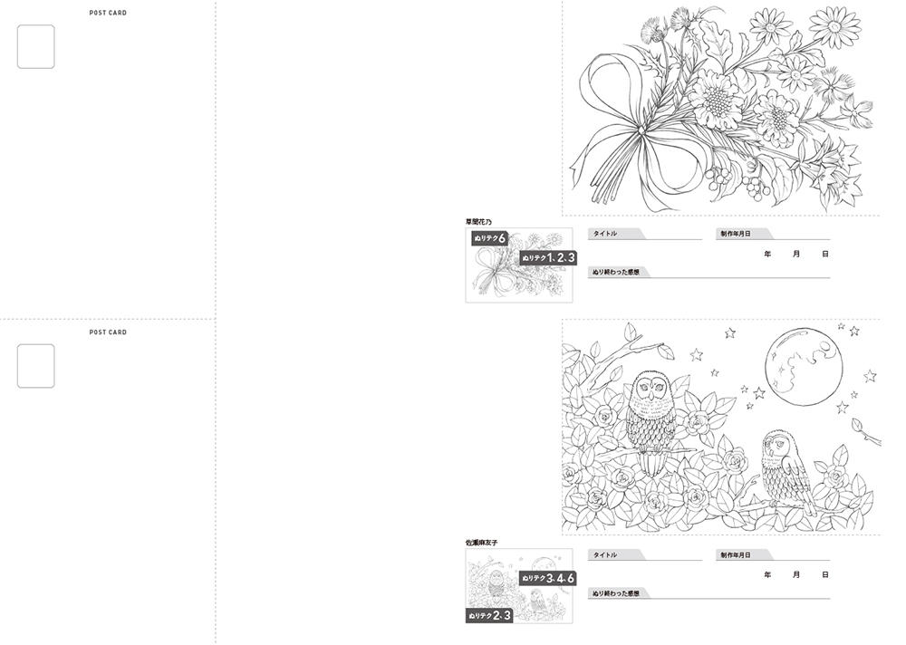 動植物をモチーフにしたぬり絵の図案を全36パターン収録。塗り方のアドバイスや絵柄についての豆知識も豊富です。切り取って出せる絵葉書サイズも。