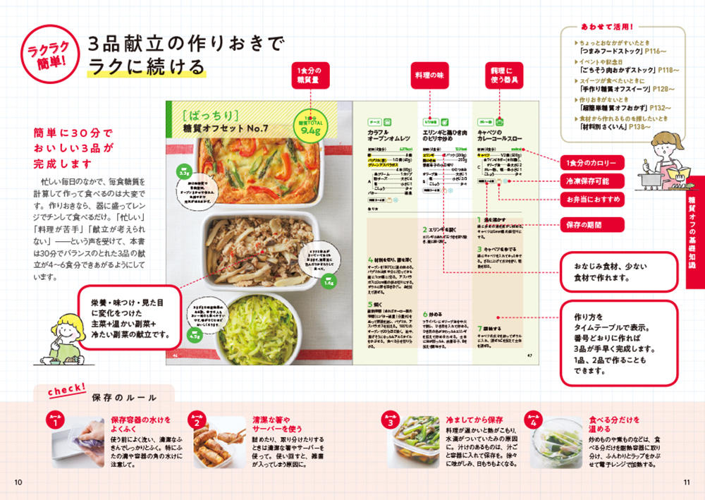 毎日の献立に悩まず、タイムテーブルの通りに作るだけで、糖質オフおかず『3品が30分』で完成します。