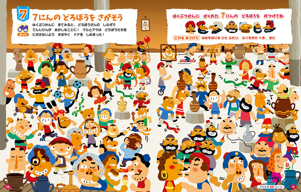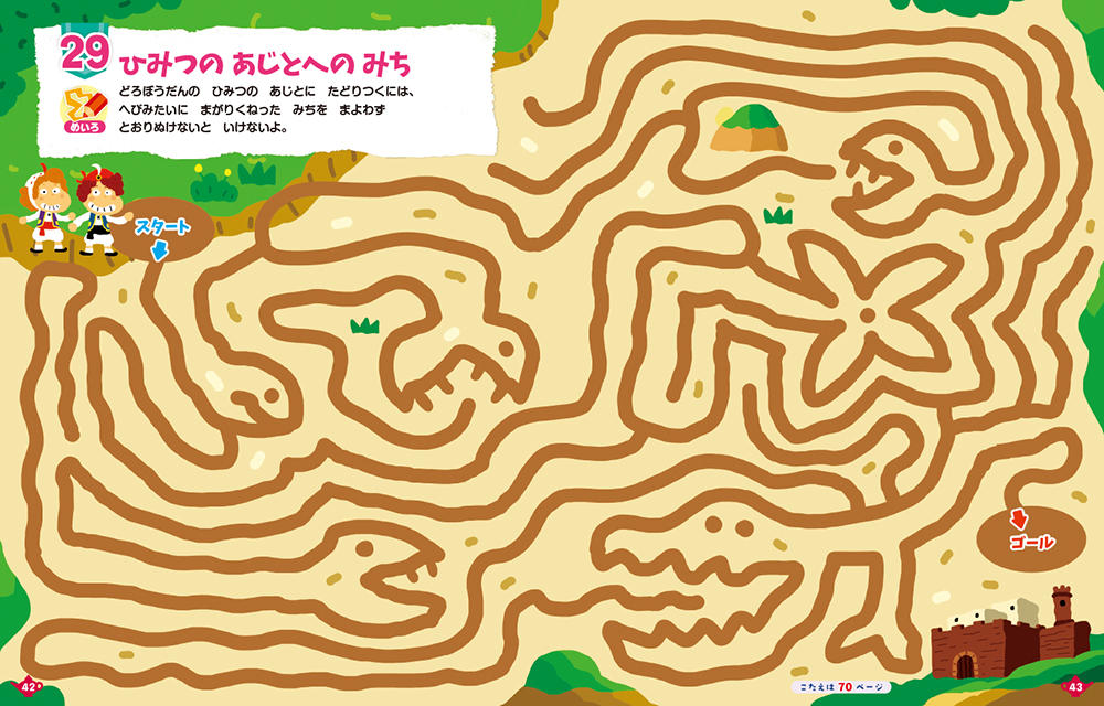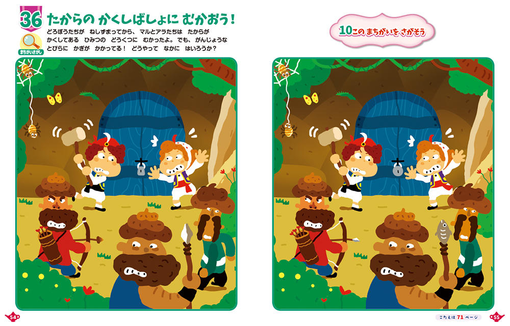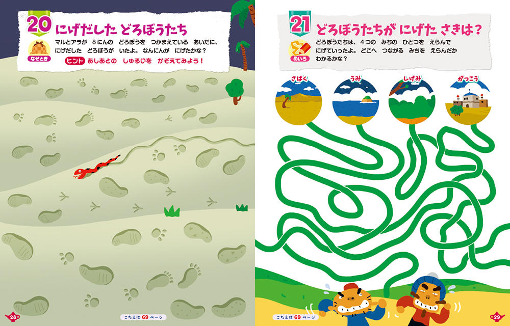 みっけ、めいろ、まちがいさがし、かくしえ、なぞときなどなど、1冊でたくさんのあそびを楽しむことができます。遊びながら集中力・観察力・思考力が養える1冊です。