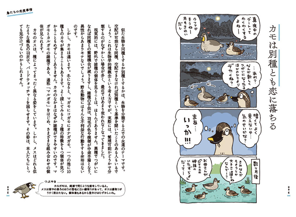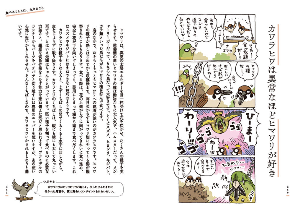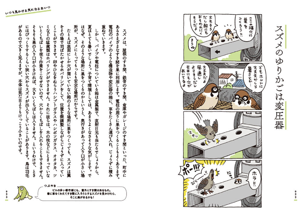 スズメ、カラス、ヒヨドリなどなど身近な野鳥をとりあげ、身近だけれどつい見過ごしがちな野鳥たちの驚きの生態を、マンガと文章とでばっさばっさと解説していきます。