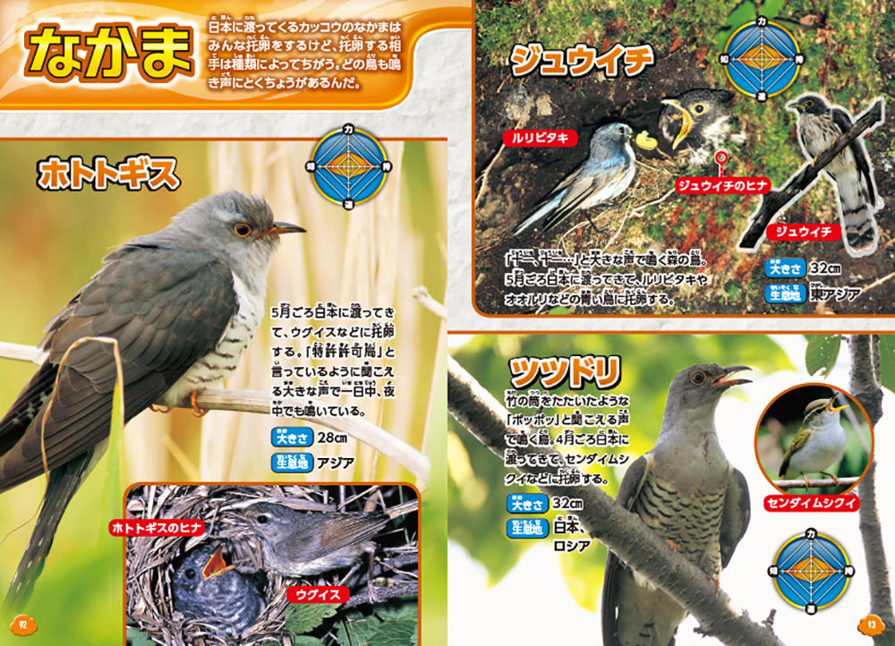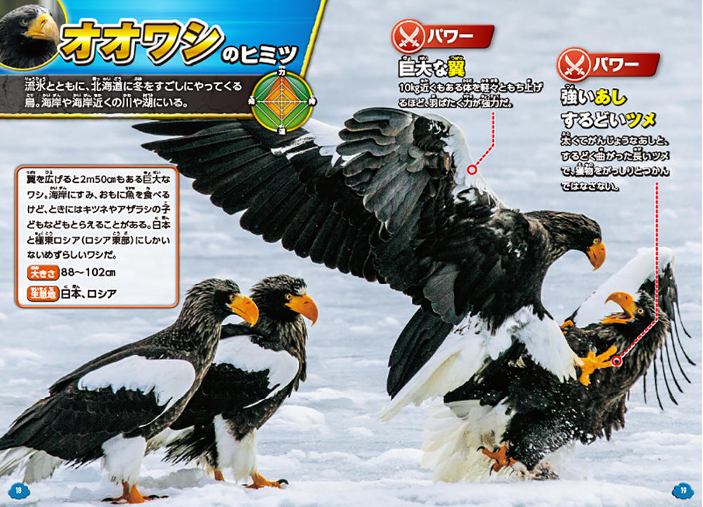 パワー自慢、超高速のスピード、かしこい頭脳、生きのびるための知恵など、バラエティ豊かな鳥たちの生態を解説。