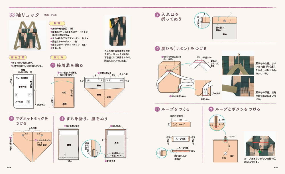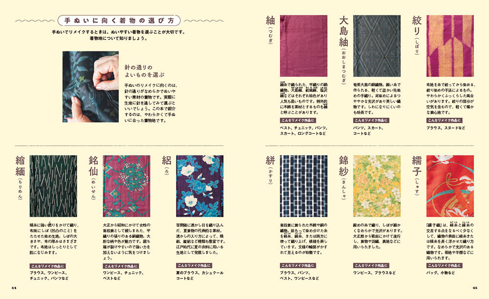 本書は、着物をほどいたら手ぬいでまっすぐぬうだけの「まっすぐリメイク」、着物の形を活かしてほどかず作る「ほどかずリメイク」、シルエットにこだわった「型紙リメイク」、3パターンのリメイク法を網羅しています。デザイン性はもちろん、作りやすさにもこだわりましたので、どれもむずかしいテクニックは必要ありません。