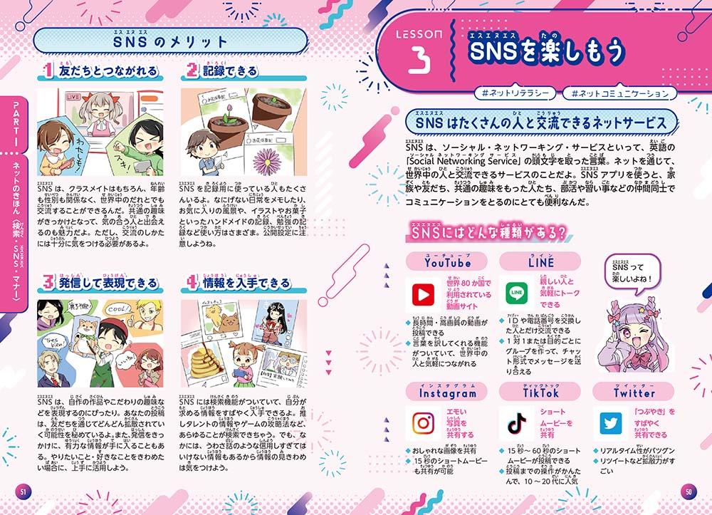 ギガスクール構想で小学生全員にタブレット端末が支給され、スマホ所有率も年々増加し、2021年時点で53.4%(総務省「青少年インターネット利用環境実態調査」)と過半数がスマホを所持。だれでもネットにアクセスできる時代となりました。それに伴い、危険なネット犯罪やネットいじめに巻き込まれるケースがあとを絶ちません。親の目から見えなくなりがちなネットの世界だけに、ネットやスマホの便利な一面だけでなく、危険性もしっかりと学ぶ必要があります。