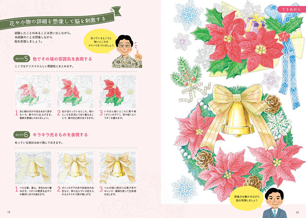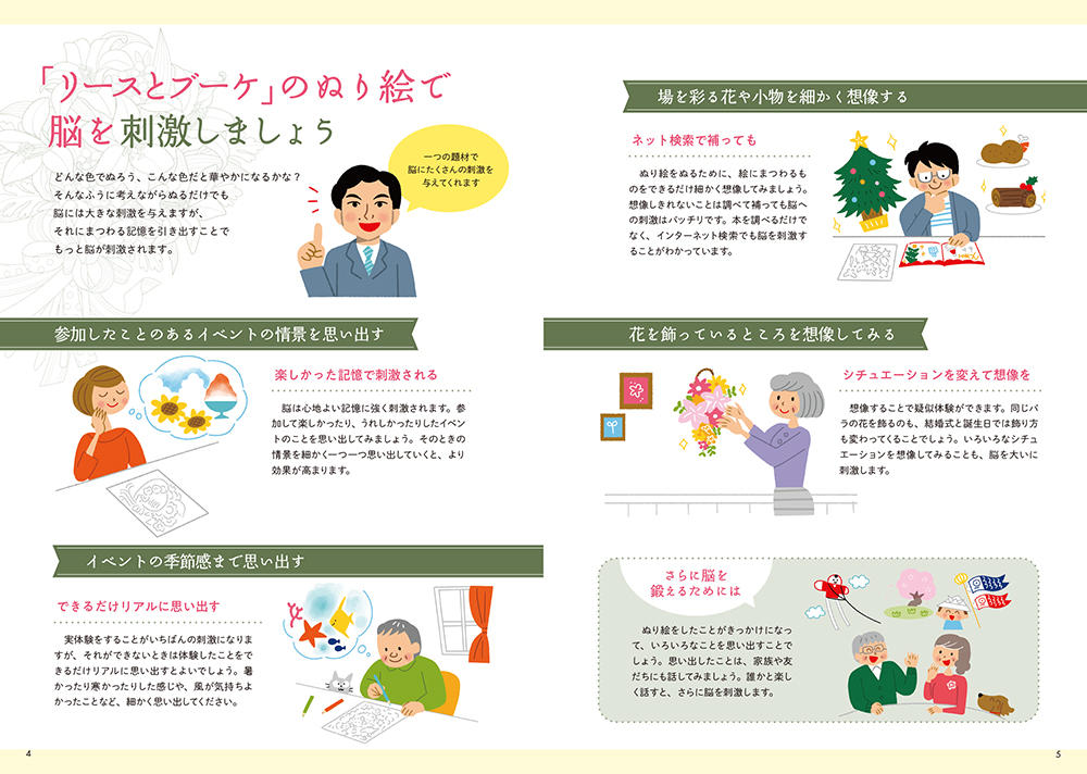 ぬり絵のモチーフとしても人気の花がいっぱいの1冊なので、ぬりたいという意欲を刺激し、脳を活性化させることができます。