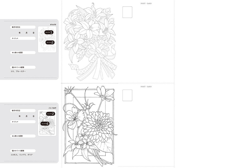 今回は、季節の花で作るリースやブーケをモチーフとした、美しいぬり絵を全38パターン収録しています。