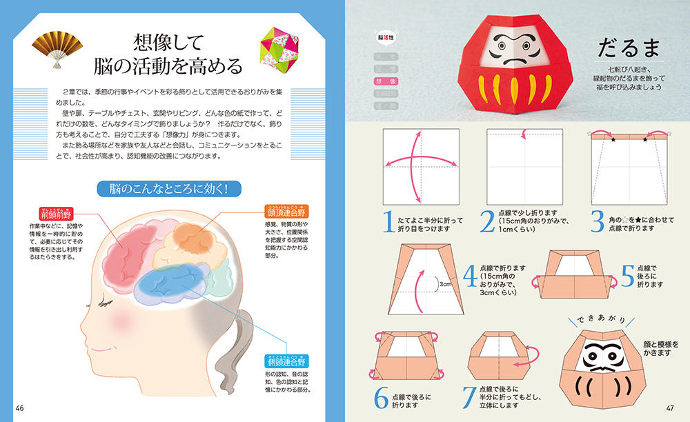 おりがみで脳をいきいき活性化!認知症予防にも! おりがみは作品や折り方によって、脳のあらゆる領域を刺激し、活性化させます。