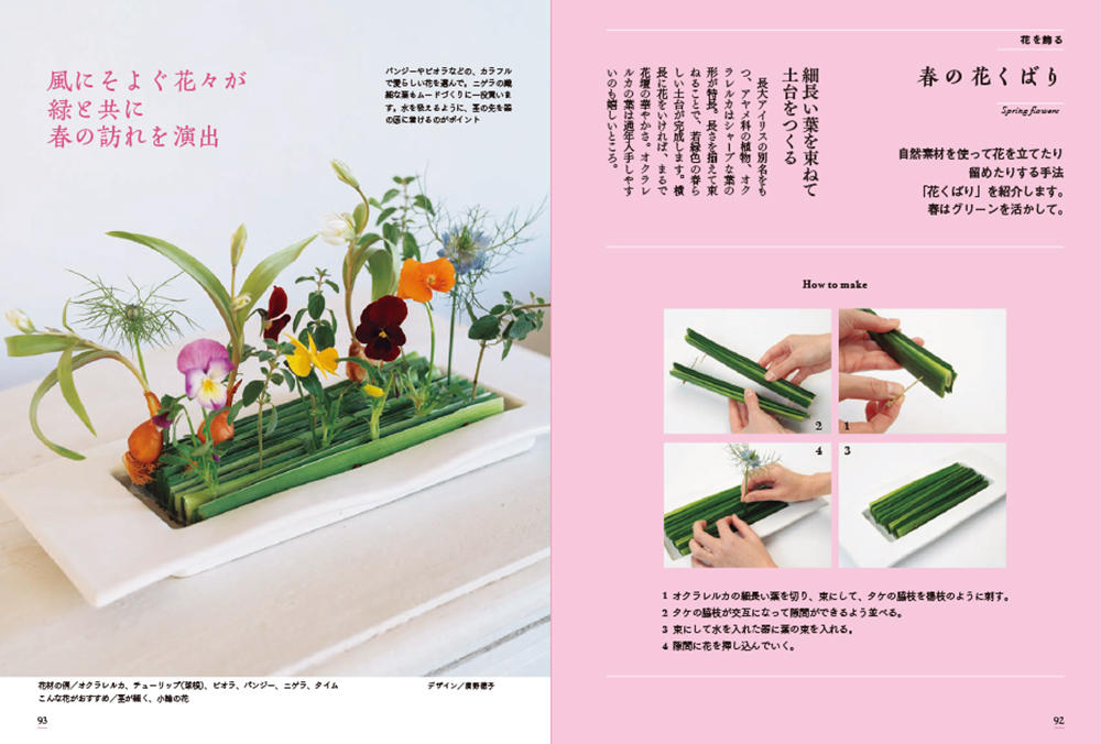 監修者が教える、花を贈る際にぴったりな「花くばり」(吸水性スポンジや剣山などは使わず、枝や葉、ツル、茎、根などの自然素材で花を立てたり留める、アレンジメントのテクニック)の実践方法を章末コラムに掲載しています。