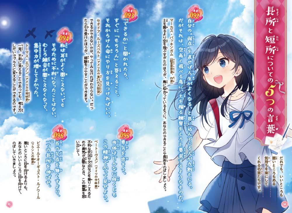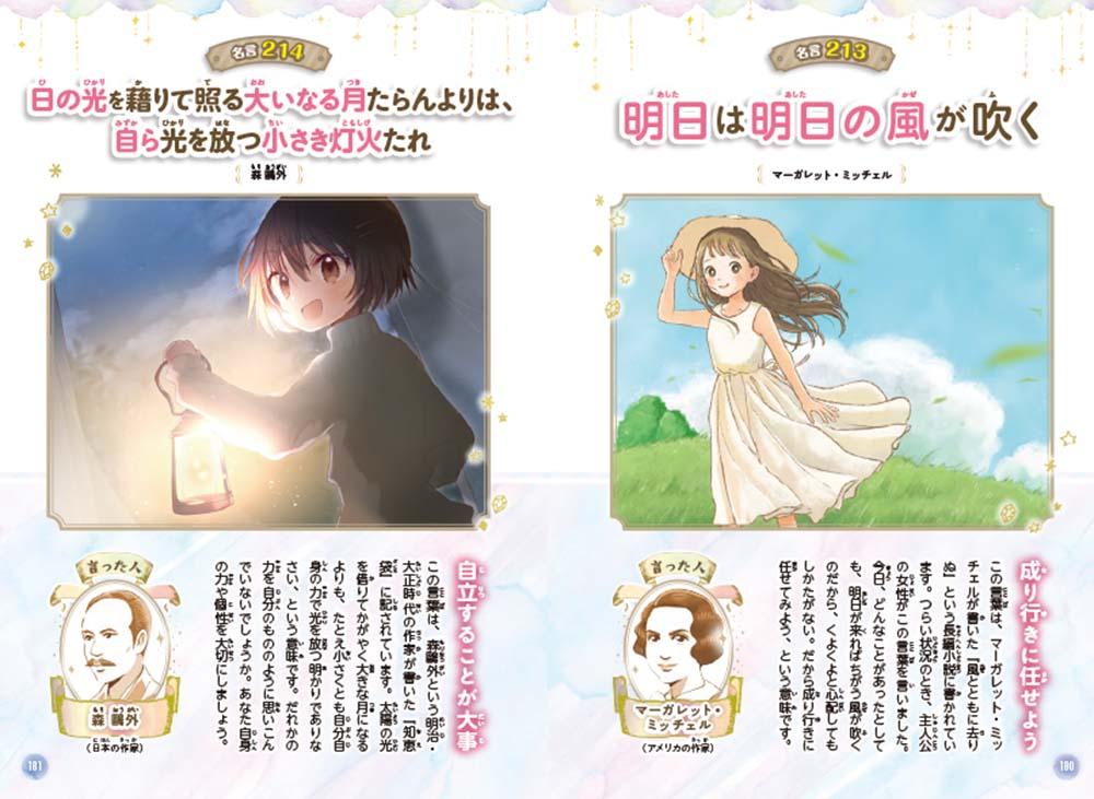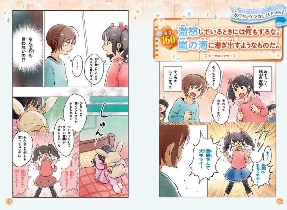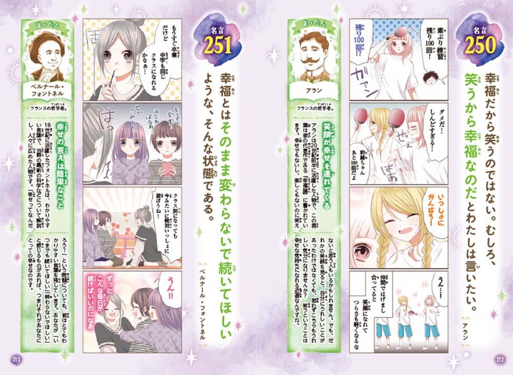 偉人や歴史上の人物の名言・心に響くことばたちを、マンガとイラストで紹介。友だち関係、学校、好きな人、家族など、小学生のみなさんが悩んでいること、思っていること、こうなりたいという気持ちに寄り添った名言、言葉を厳選。