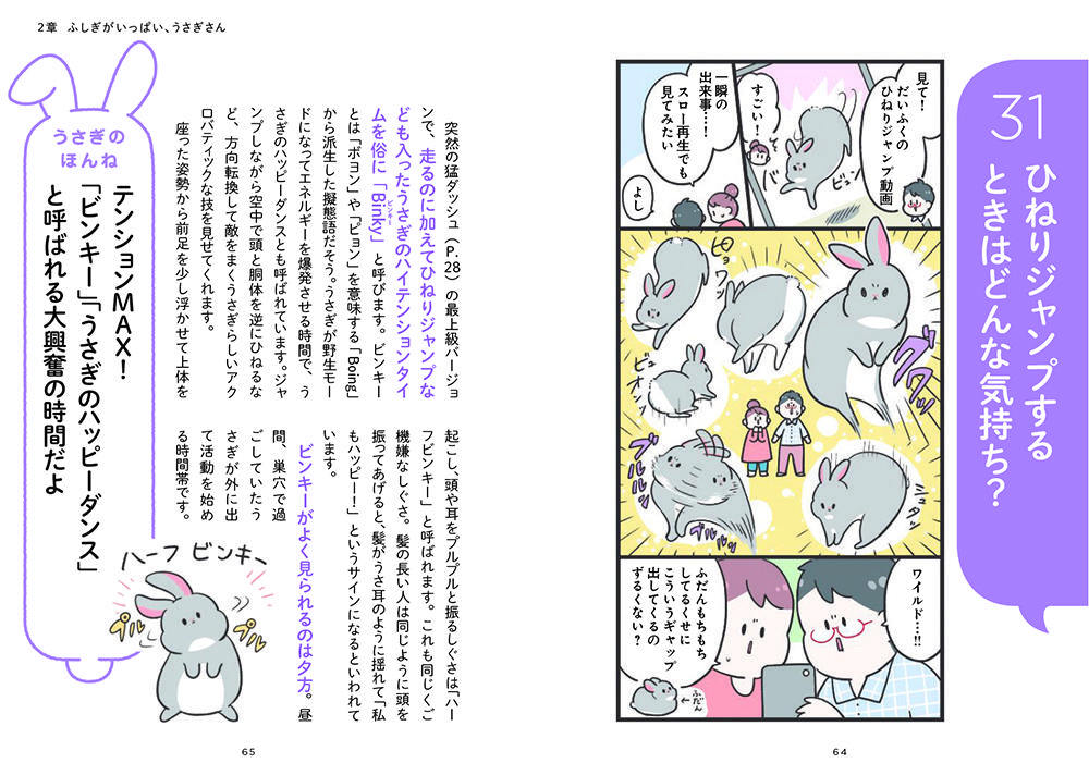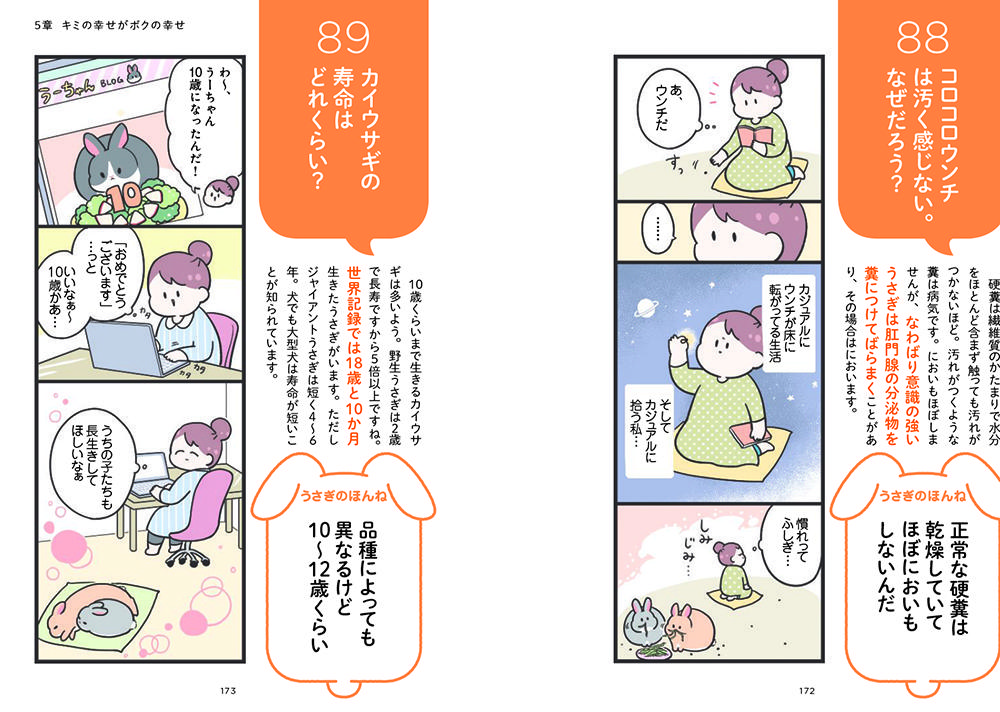 「うさぎの毛づくろいがかわいいワケ」 「うさぎはオスよりメスが強い」 「うさぎはじつは月夜が苦手?」 「うさぎの育児は1日2分!」 「うさぎの飼い主はのんびり屋が多い?」 へええと驚き、プッと笑って、 うさぎの奥深さに思わずうなる。 読めばますますうさぎが 大好きになること間違いなしの1冊です。