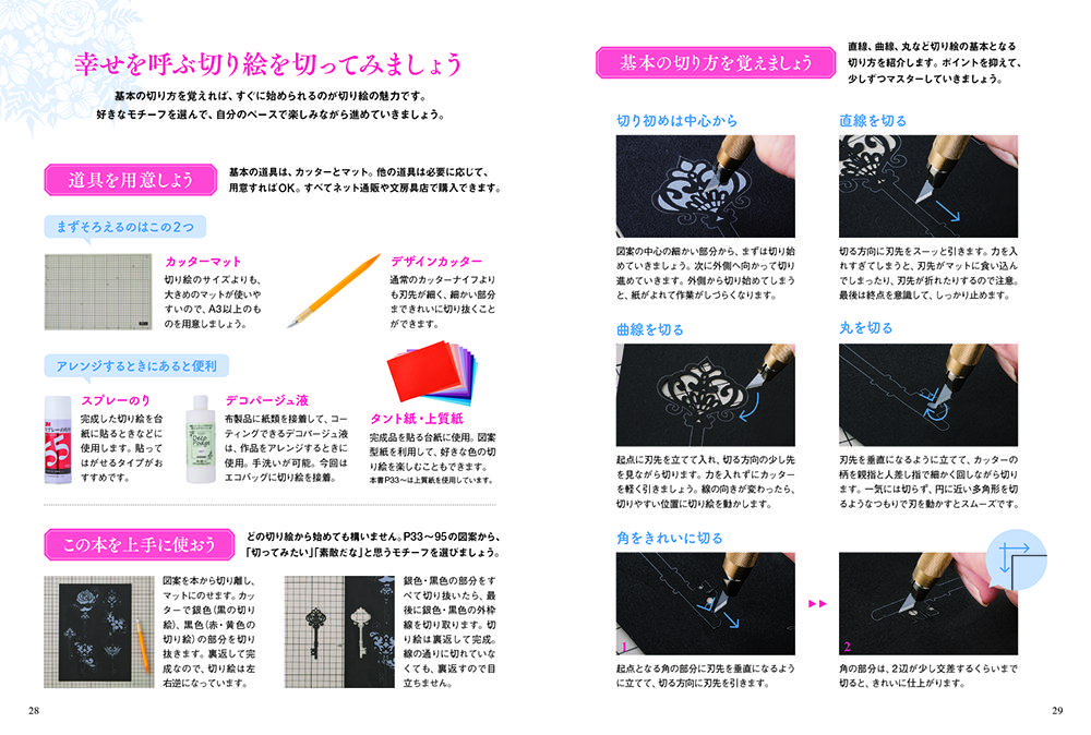 業界初!切り絵をやったことない人でも安心。切り取ってそのまま切り絵ができる作りやすい本になりました。お部屋に飾ったり、しおりにしたり、プレゼントにも!