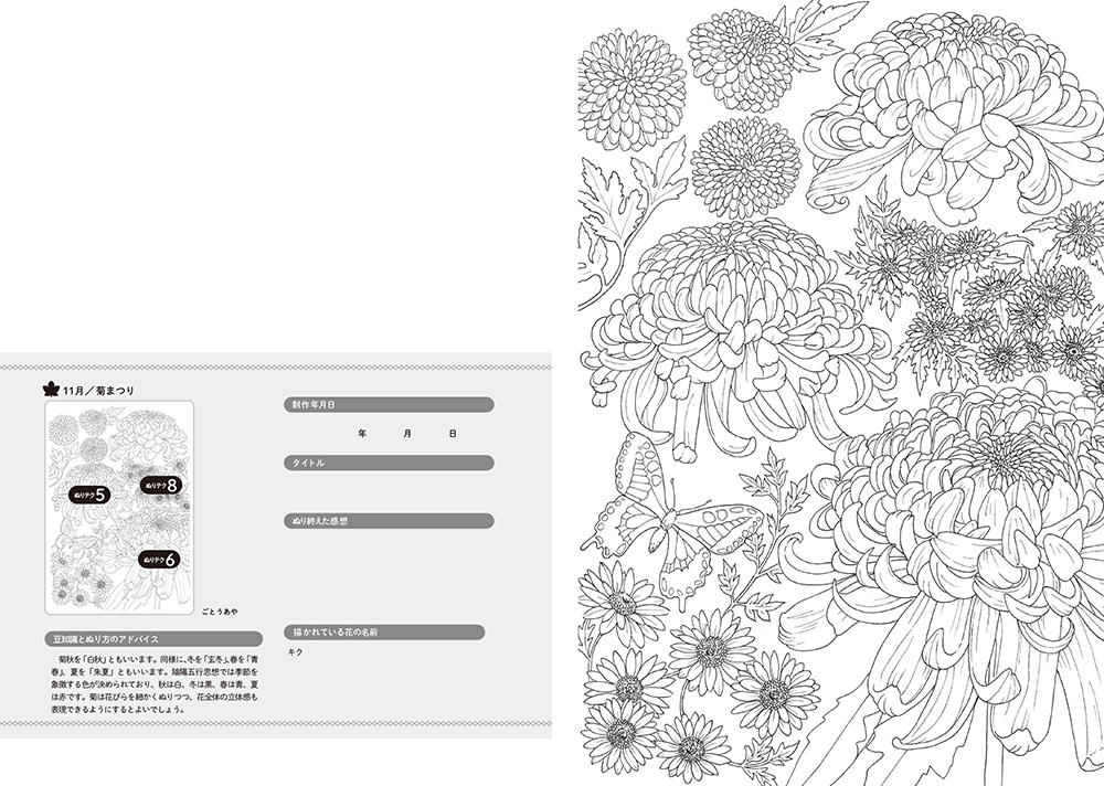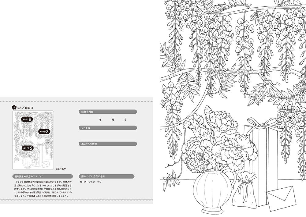 今回は、日本の四季の花々を伝統行事や習わしとともに描いたぬり絵を全38パターン収録しています。
