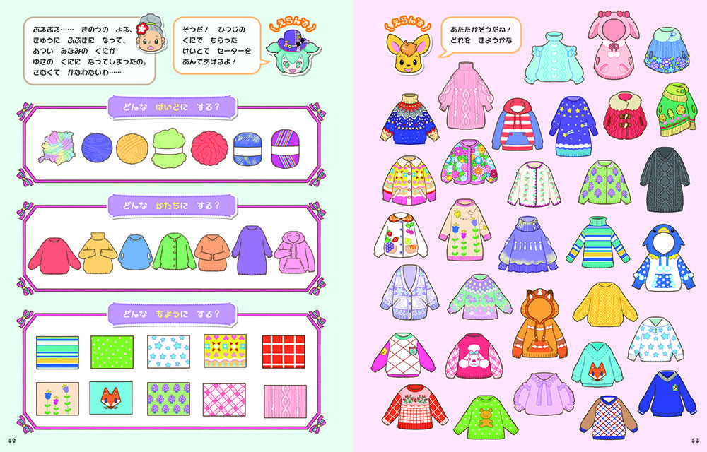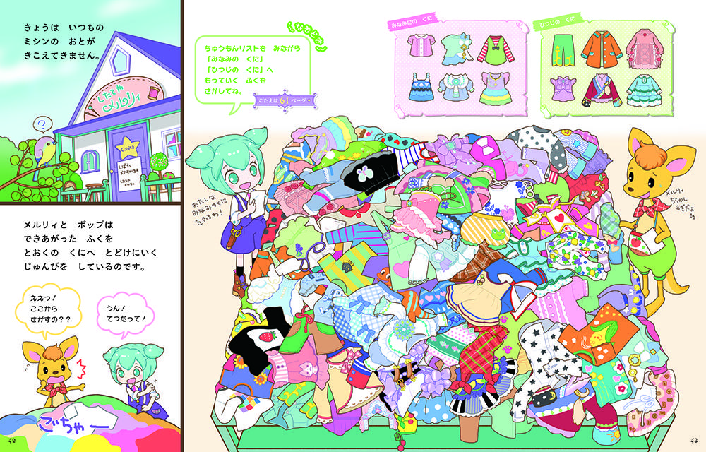 ようせい王国、カンガルーの村、羊の国を冒険しながら、すてきな洋服を作ります! まちがいさがし、めいろ、みっけ、なぞとき・・・楽しいあそびが22種類!