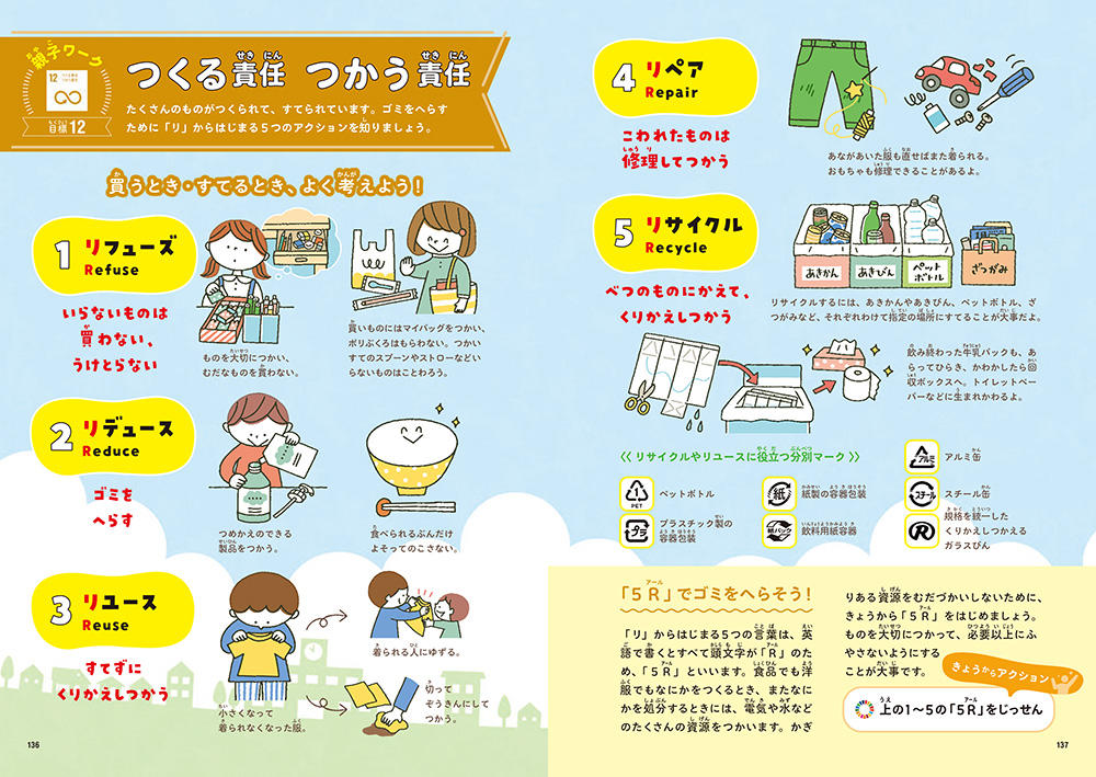 本書は、SDGsのきほんをやさしく教える、読み聞かせ絵本です。心に響くバリエーション豊かな17のお話で、地球に生きるわたしたちにとって大事なことが自然と理解できます。また、各お話のあとには親子で取り組むワークページを設けています。SDGsの目標と世界の課題をやさしく解説。ワークでこどもの意見を引き出し、あるべき姿を考えます。