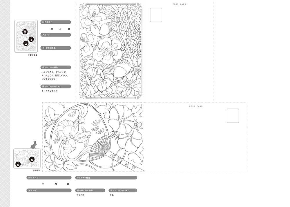 猫、犬、ウサギ、リス、小鳥、蝶々など可愛らしく癒されるいきものたちと、美しい花々のぬり絵です。