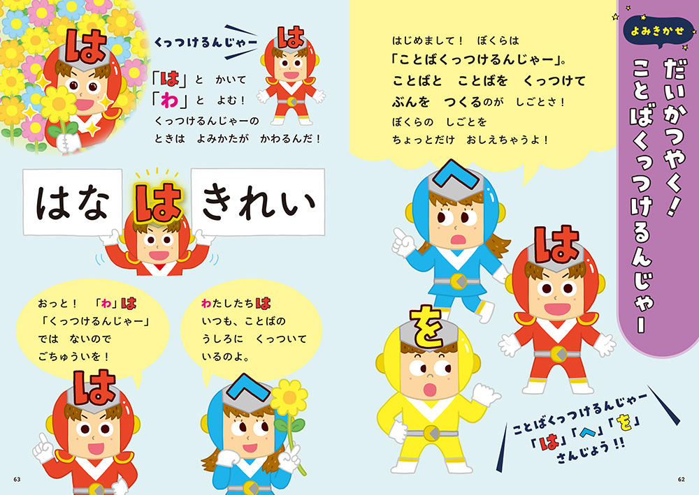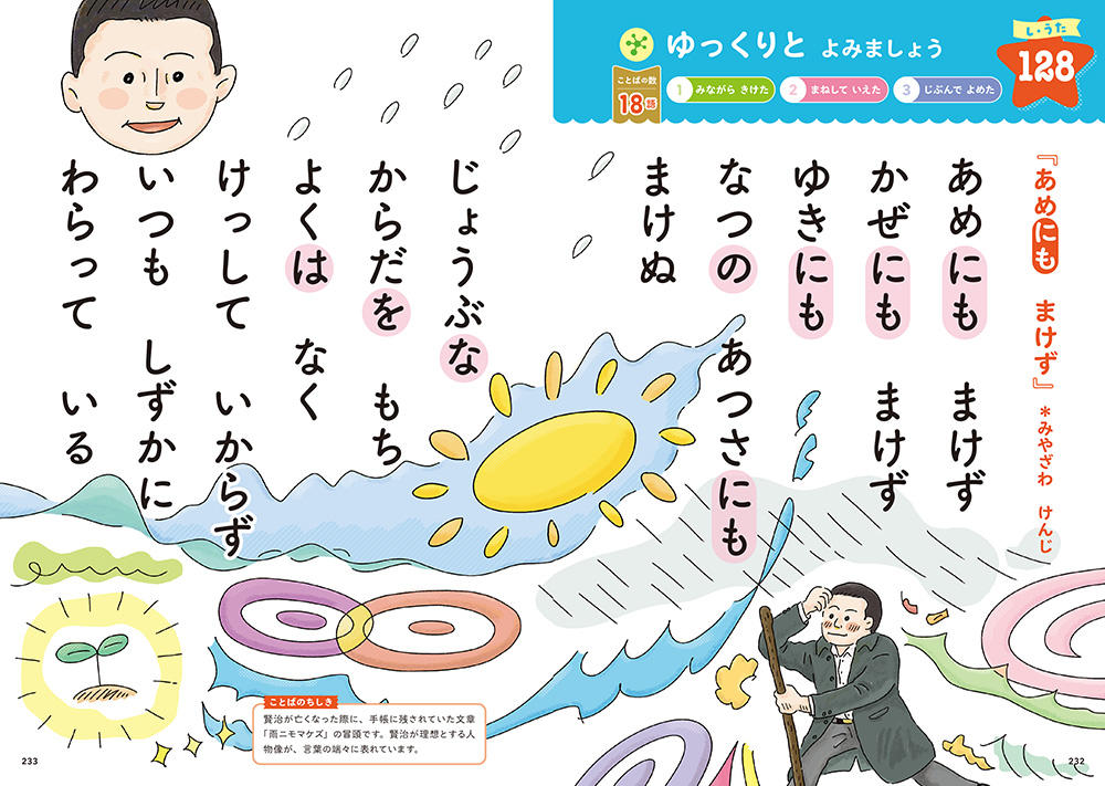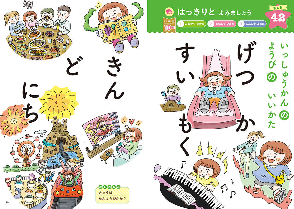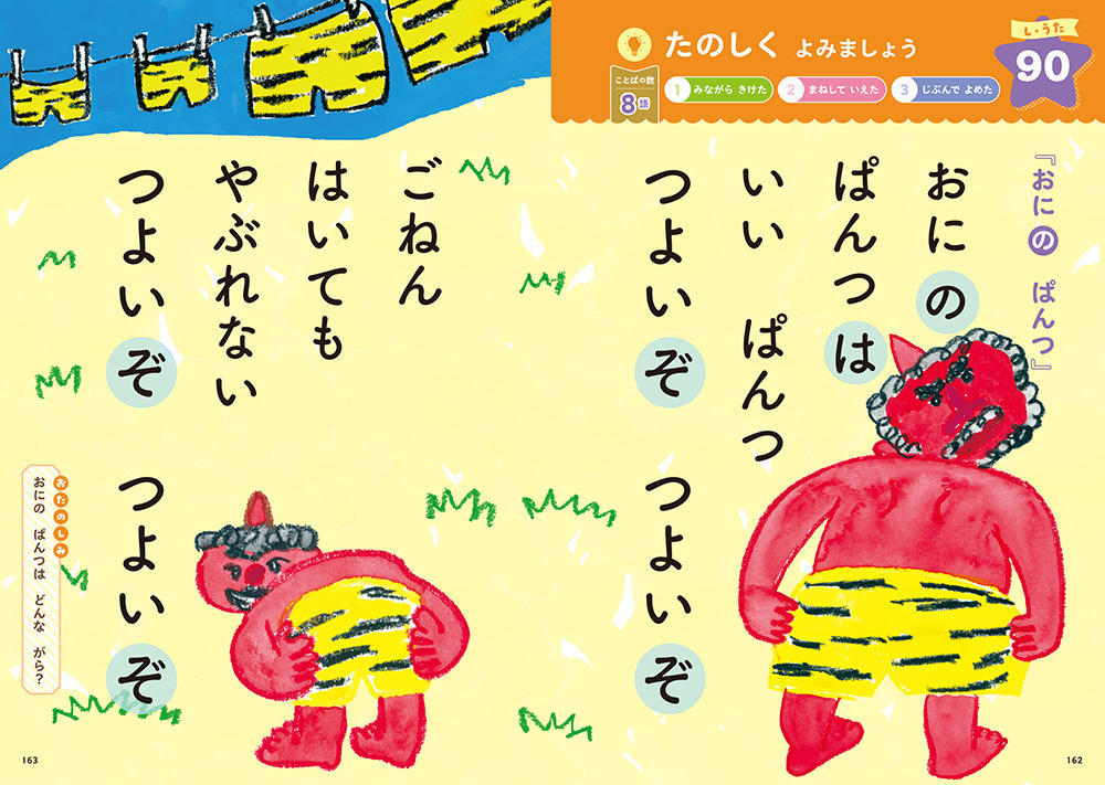 脳の発達とことばの発達にあわせ、ことばのセレクト、挿絵、文字の大きさ・太さ、助詞の区別など、子ども興味を引き出し、理解を促す工夫を凝らしています。「読み聞かせ音読」からはじめ、「復唱」を楽しむうち、無理なく自然に「音」と「ことば」と「文字」とが結びついていきます。
