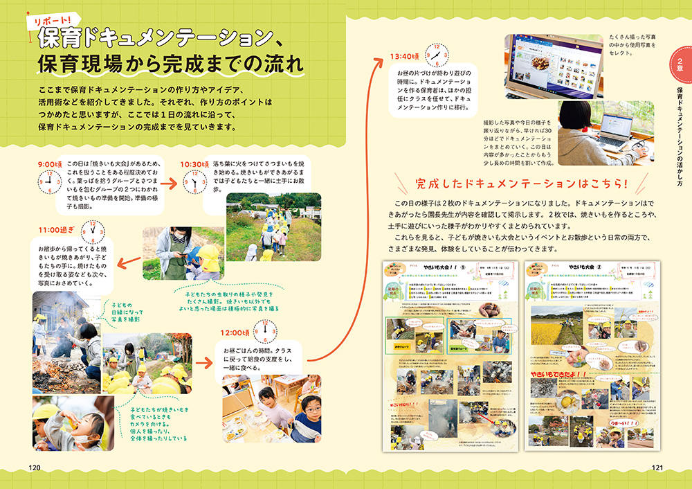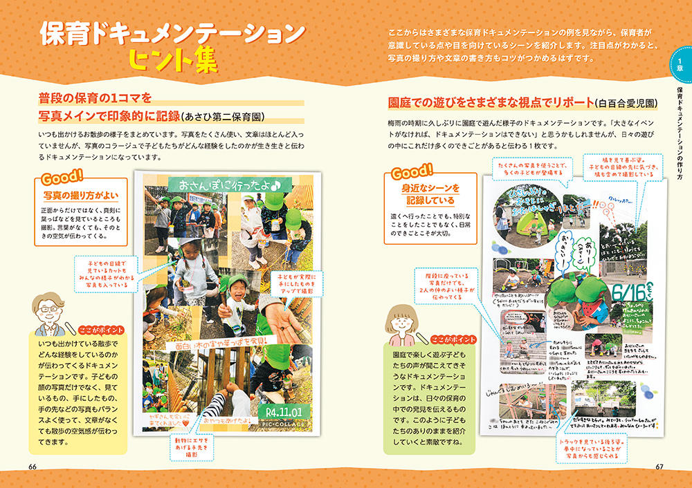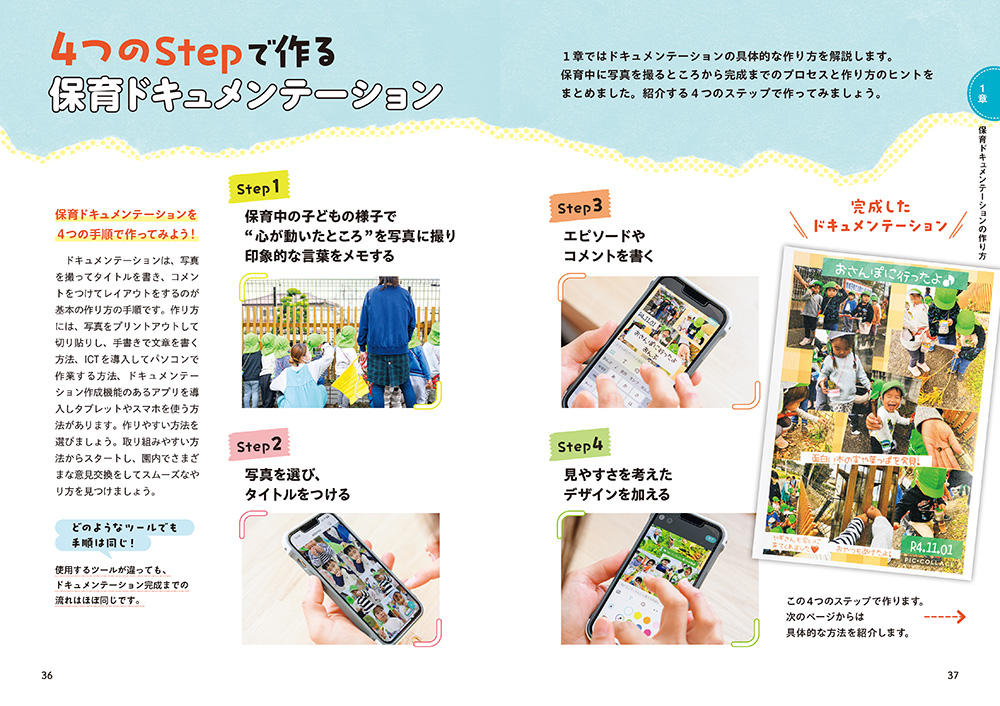 本書では、「保育のドキュメンテーションとはなにか?」を大きな写真と分かりやすい見出しと言葉で解説。