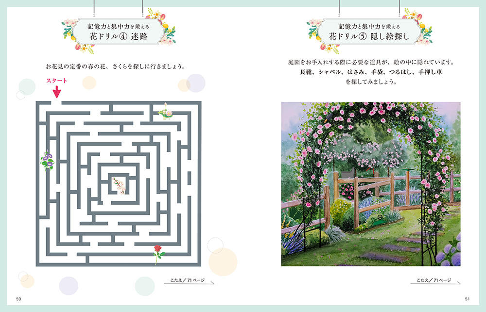 記憶力と集中力を育む花にまつわるクイズも収録されているため、60代以降の脳トレ本としてもおすすめの一冊です。