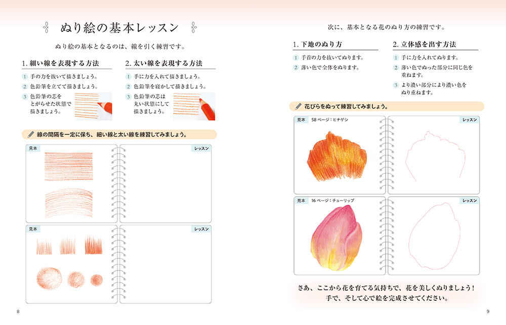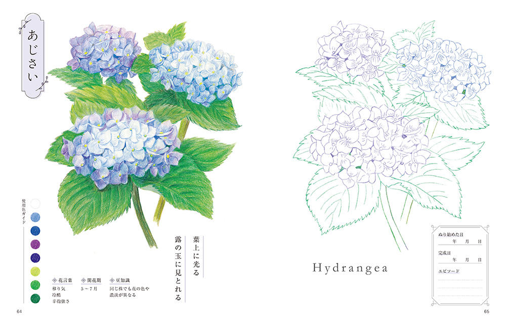 見開き左ページの着彩された色見本を見ながら、右ページで実際にぬり絵ができるので、初心者も手軽に始められるつくりとなっております。