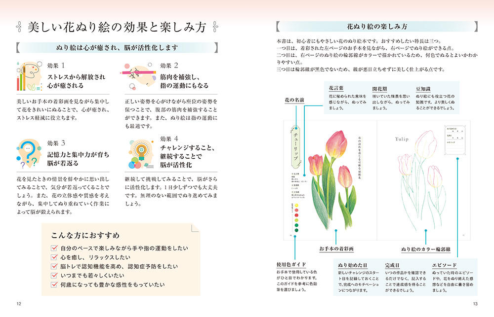 また、右ページのぬり絵の花は、カラー輪郭線で描かれているため、高齢者がどこを何色で塗るとよいかのガイドになっている点も、わかりやすいポイント。