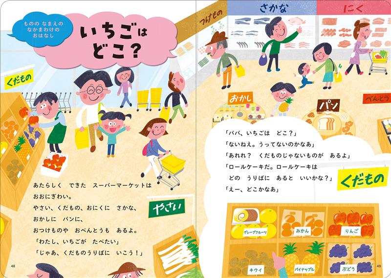 ★スーパーにやってきた親子。いちごを探すが、くだもの売り場にない。代わりにあったのはロールケーキ。「ロールケーキは、どの売り場に戻すといいのかな?」ちがう売り場にある商品を、すべて元の売り場に戻そう!(「いちごは どこ?」上位語・下位語のお話)