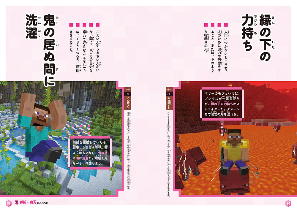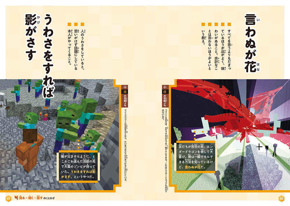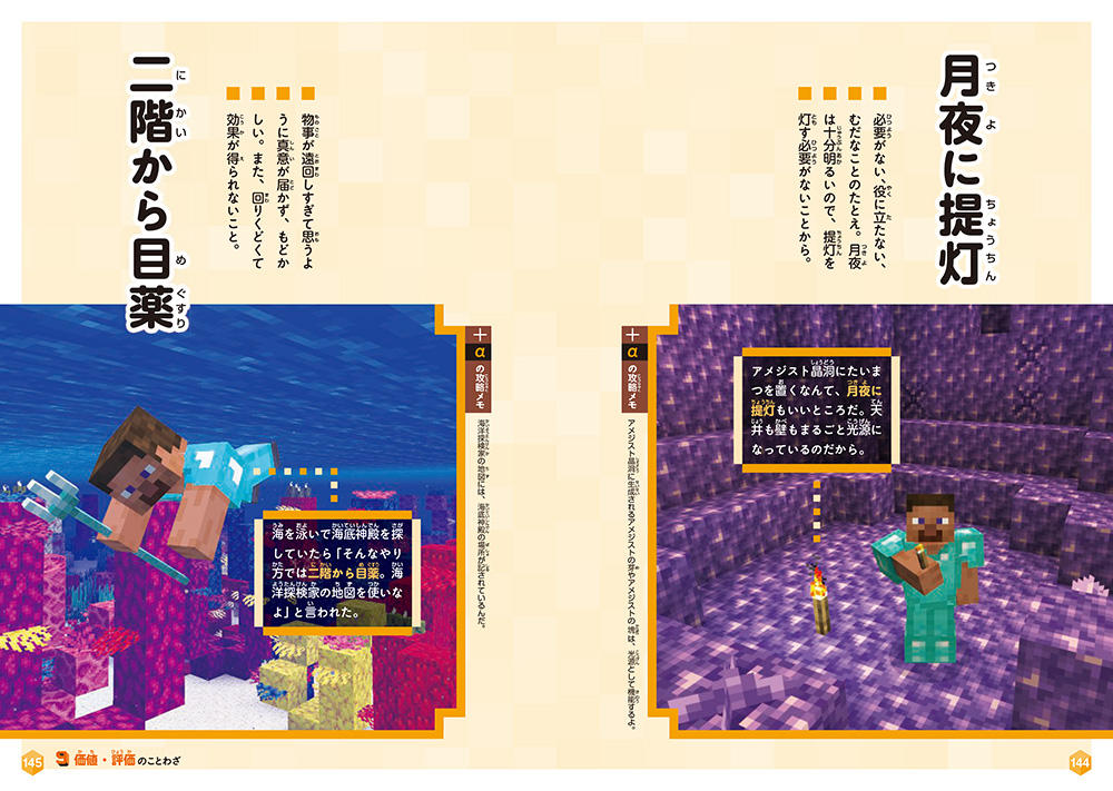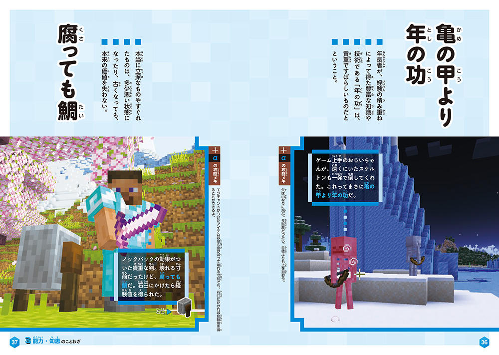 ことわざの意味をマイクラのシーンであらわした本書は、マイクラ好きのお子さんの心をつかみ、広いことばの大海に漕ぎ出すきっかけとなるはず。