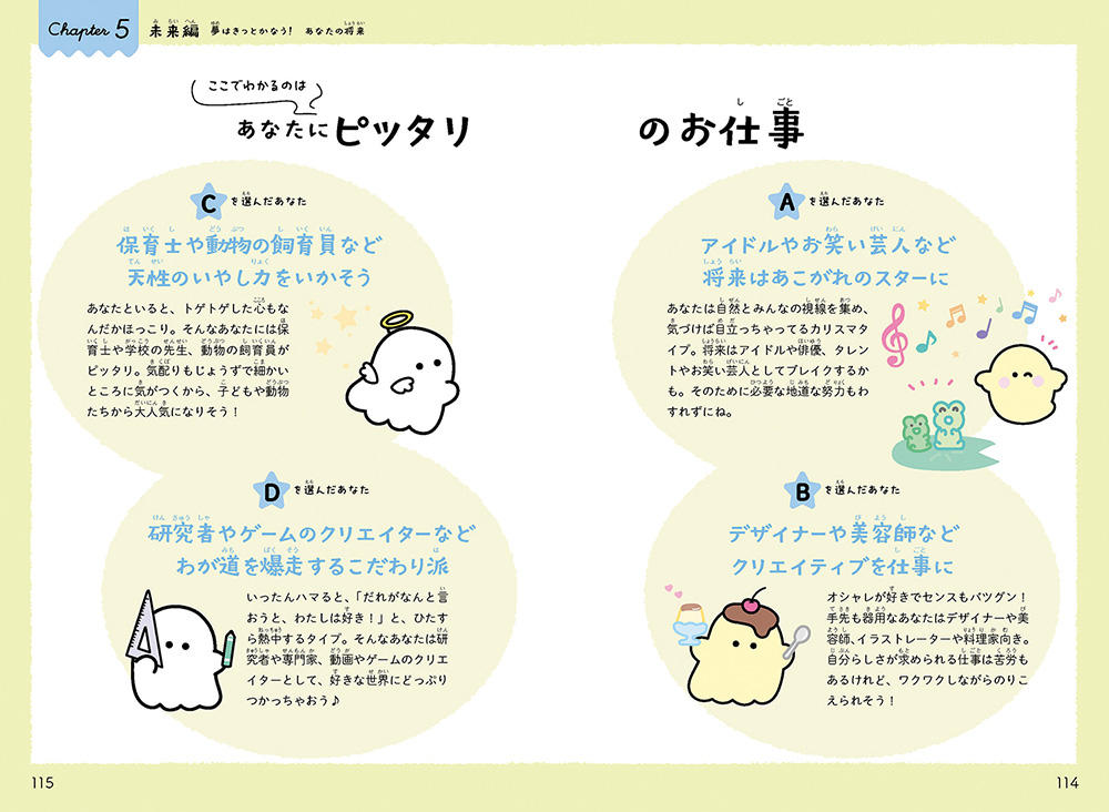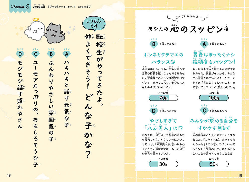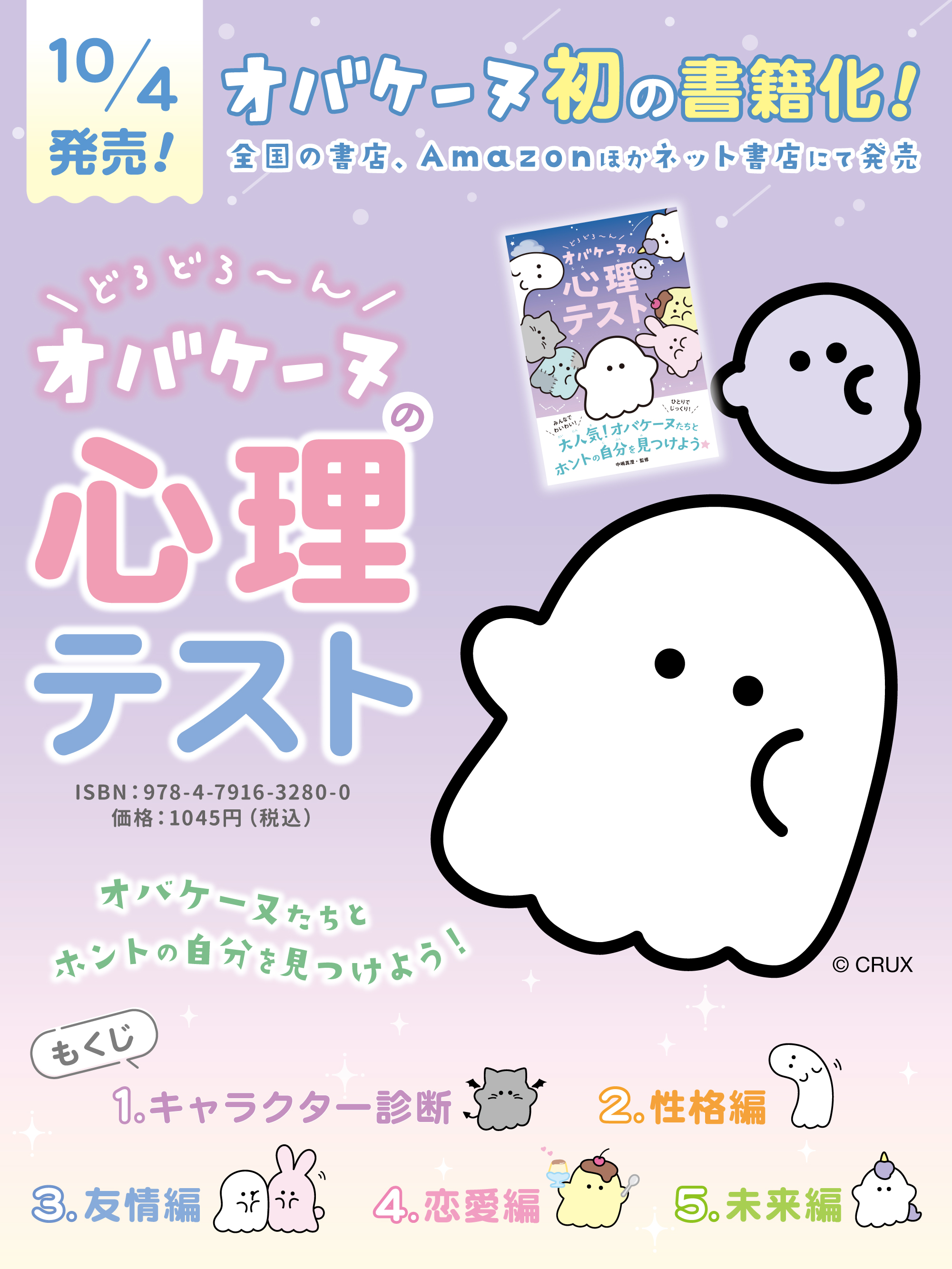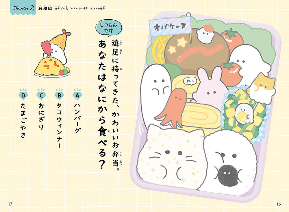 この本は、個性ゆたかなオバケーヌたちといっしょに、心の奥にひそんでいるホントの自分を見つける本です。あなたの性格やホンネ、友情や恋や未来まで、びっくりするほどあたっちゃいます。