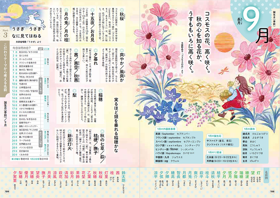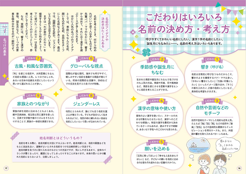 本書は、戸籍法改正の審議会メンバーである国語学者の笹原教授監修により、名づけの基本をくわしく解説します。また、基本を踏まえた素敵な名前例も圧倒的なボリュームで紹介していますので、パパ・ママの思いがこもった、ぴったりの名前がかならず見つかるはずです。