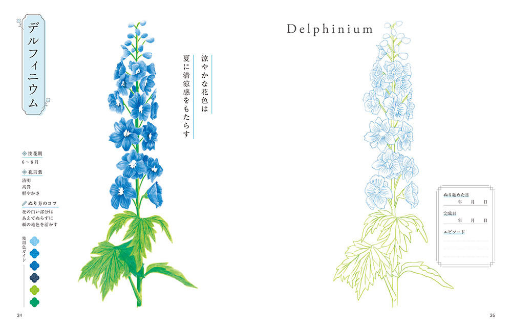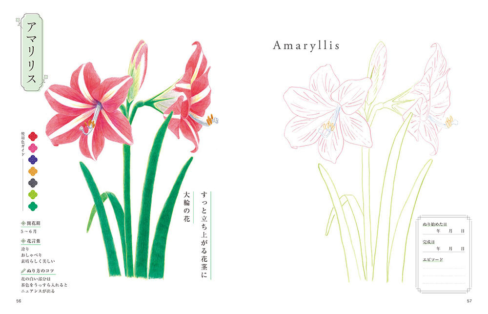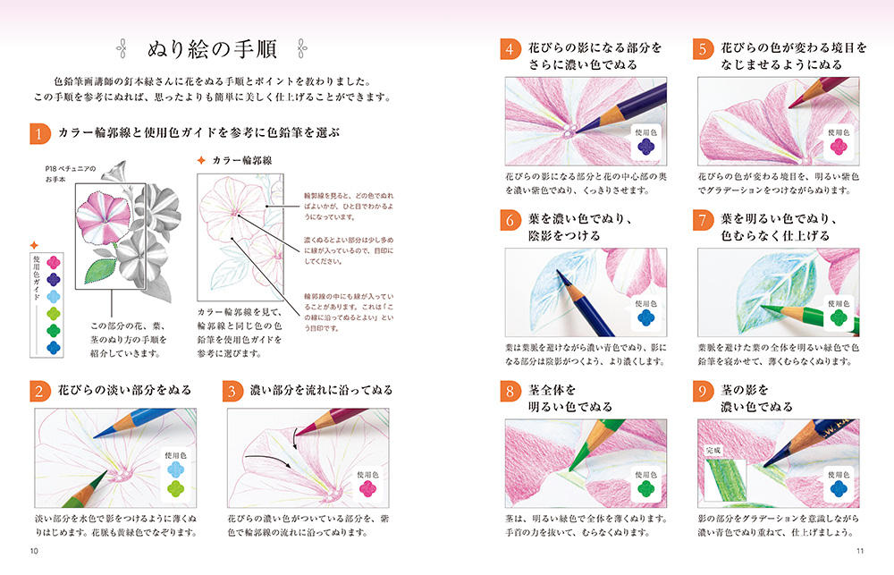 見開き左ページの着彩された色見本を見ながら、右ページで実際にぬり絵ができるので、初心者も手軽に始められます。