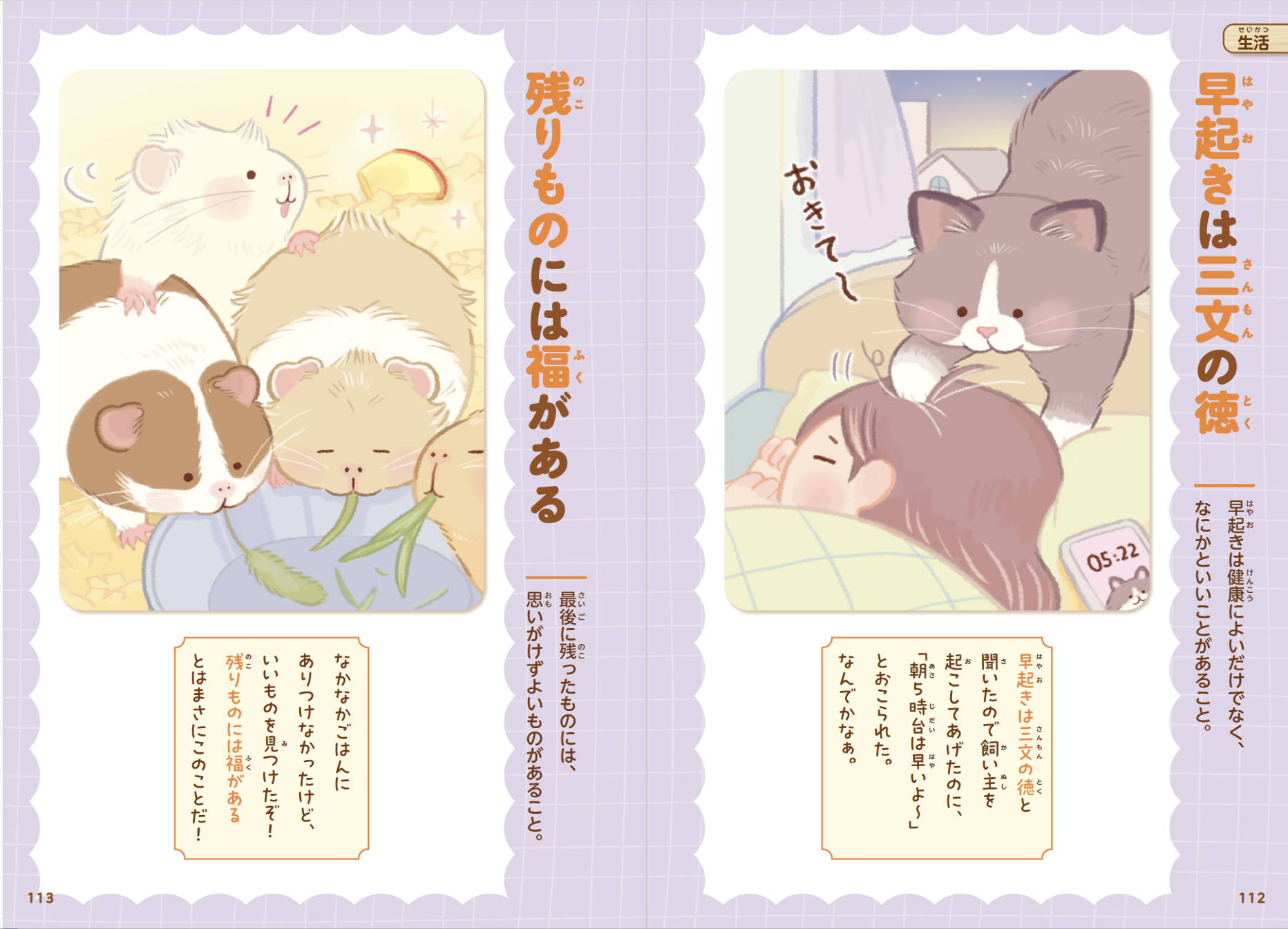 「猫に小判」「犬も歩けば棒に当たる」「猿も木から落ちる」など、いきものが出てくることわざから、「類は友を呼ぶ」「鬼の目にも涙」など、覚えておきたいことわざまでたっぷり解説しています。