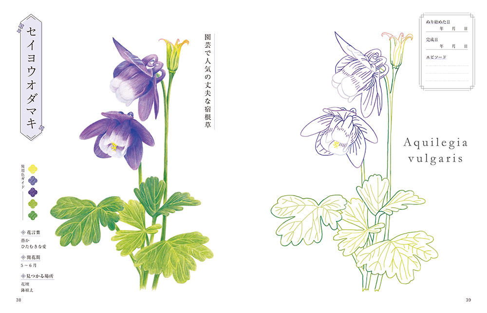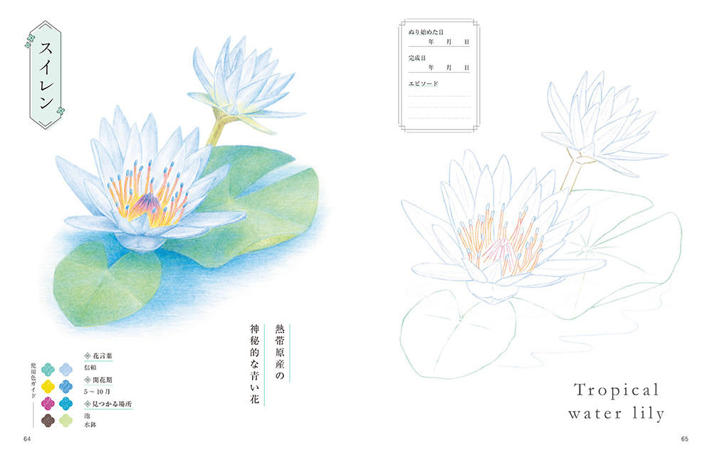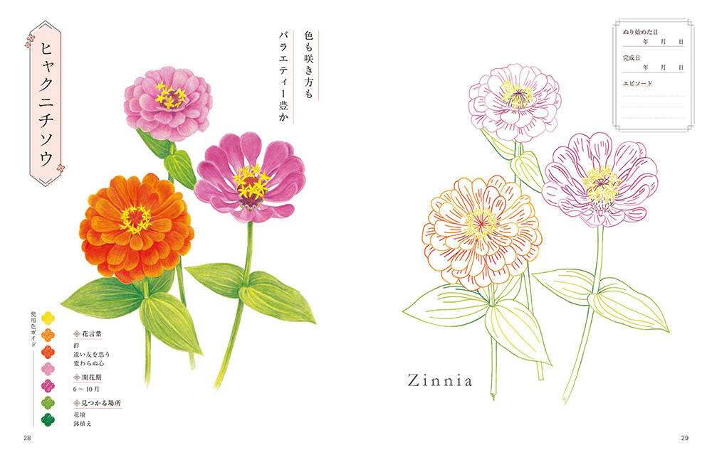 ・見開き左ページの着彩された色見本を見ながら、右ページで実際にぬり絵ができるので、初心者も手軽に始められます。