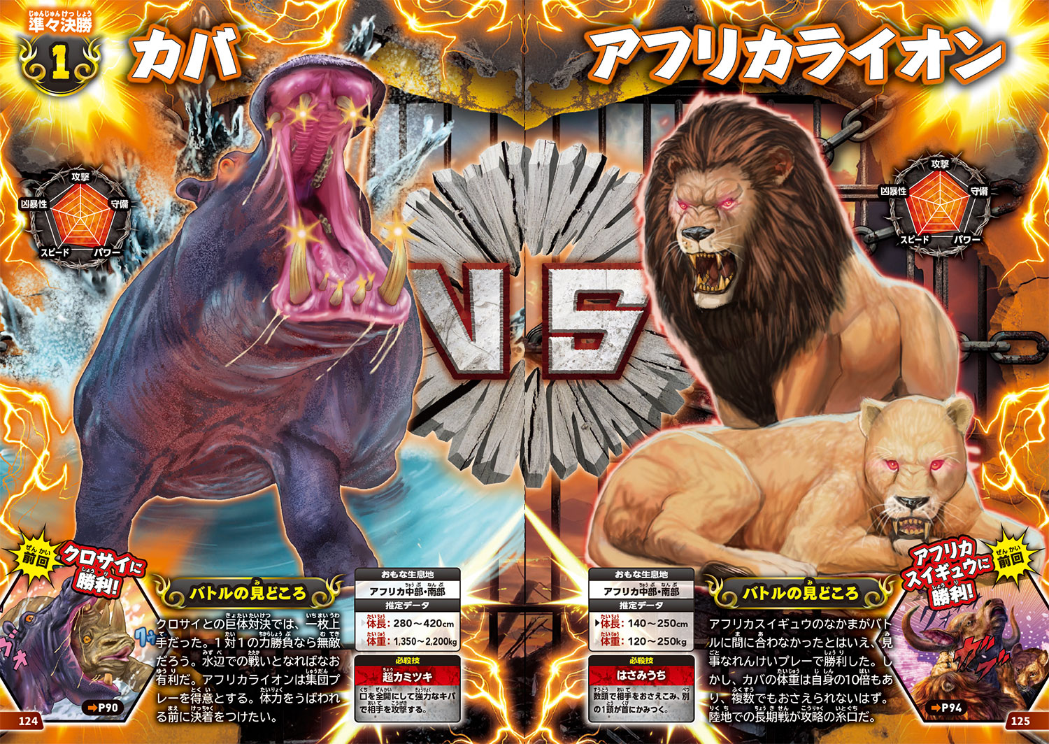 カバ/グリズリー/ベンガルトラ/コモドオオトカゲ/ヘラジカ/クロサイ/アフリカスイギュウ/カンムリクマタカ/アフリカライオン/イリエワニ/ドール/ホホジロザメ/ニホンイノシシ/ブチハイエナ/ハイイロマングース/ブラックマンバ/カミツキガメ/オオアナコンダ/ラーテル/セイウチ/ホッキョクグマ/シャチ/アフリカバイソン/バーチェルグンタイアリなど