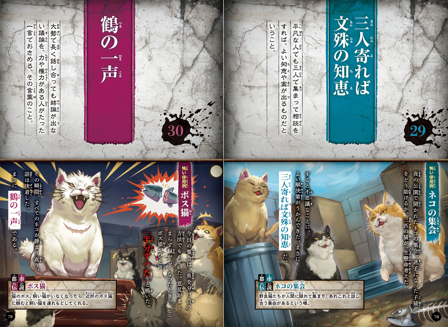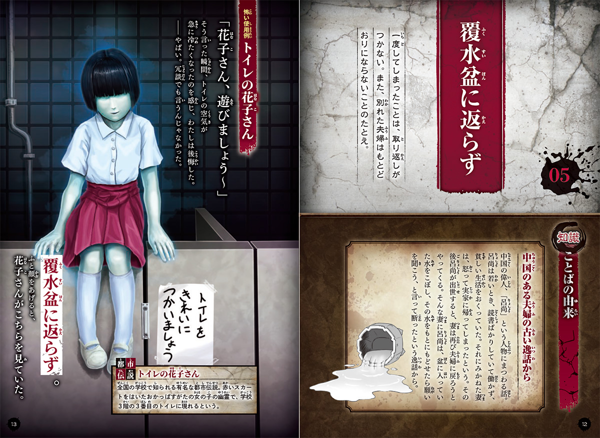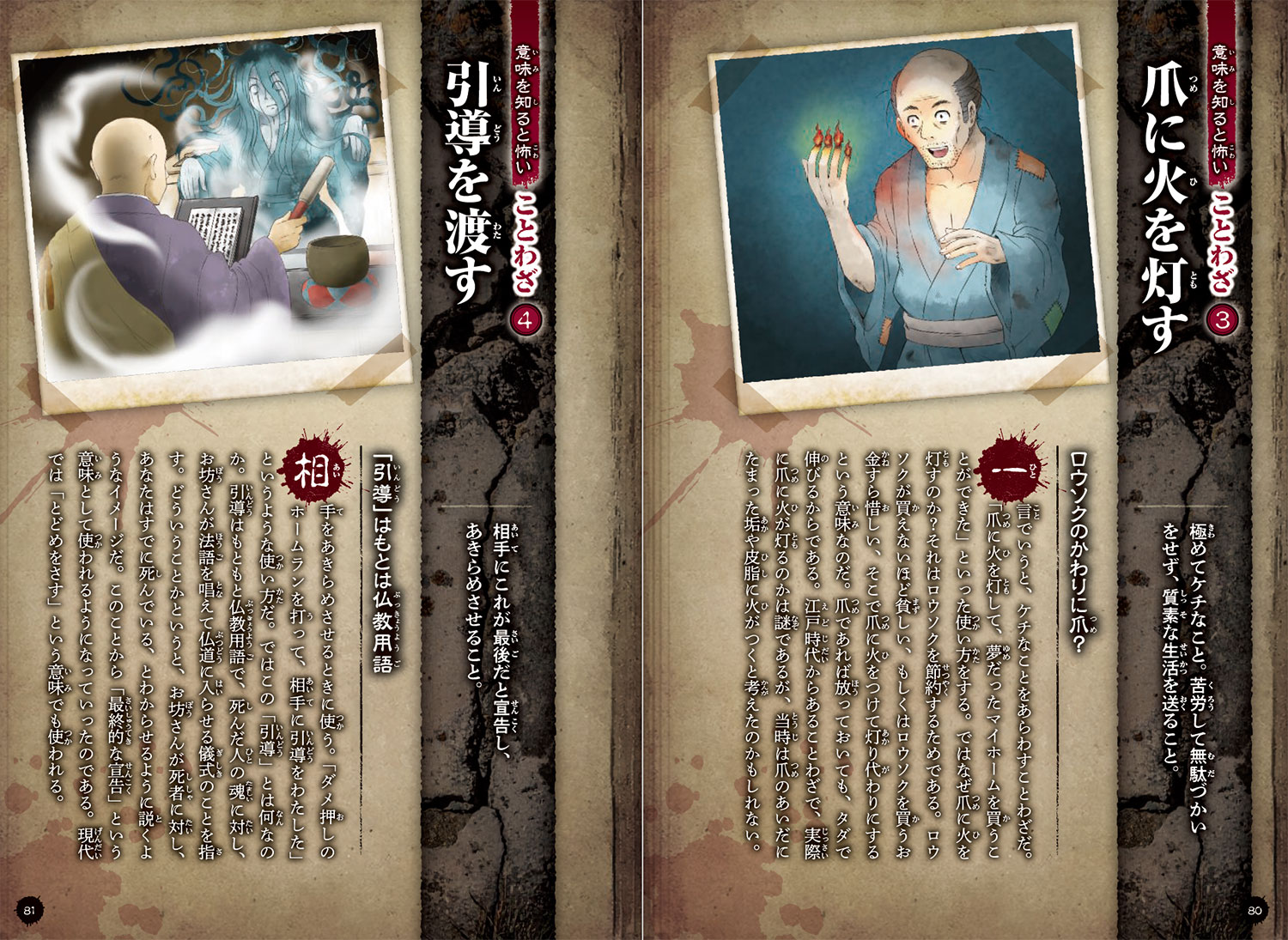 日常でよく使うことわざを厳選し、 都市伝説の大迫力ビジュアルとともに怪談風の例文で紹介。 ゾクゾク楽しく学べて、ことわざが怖いほどみにつく!