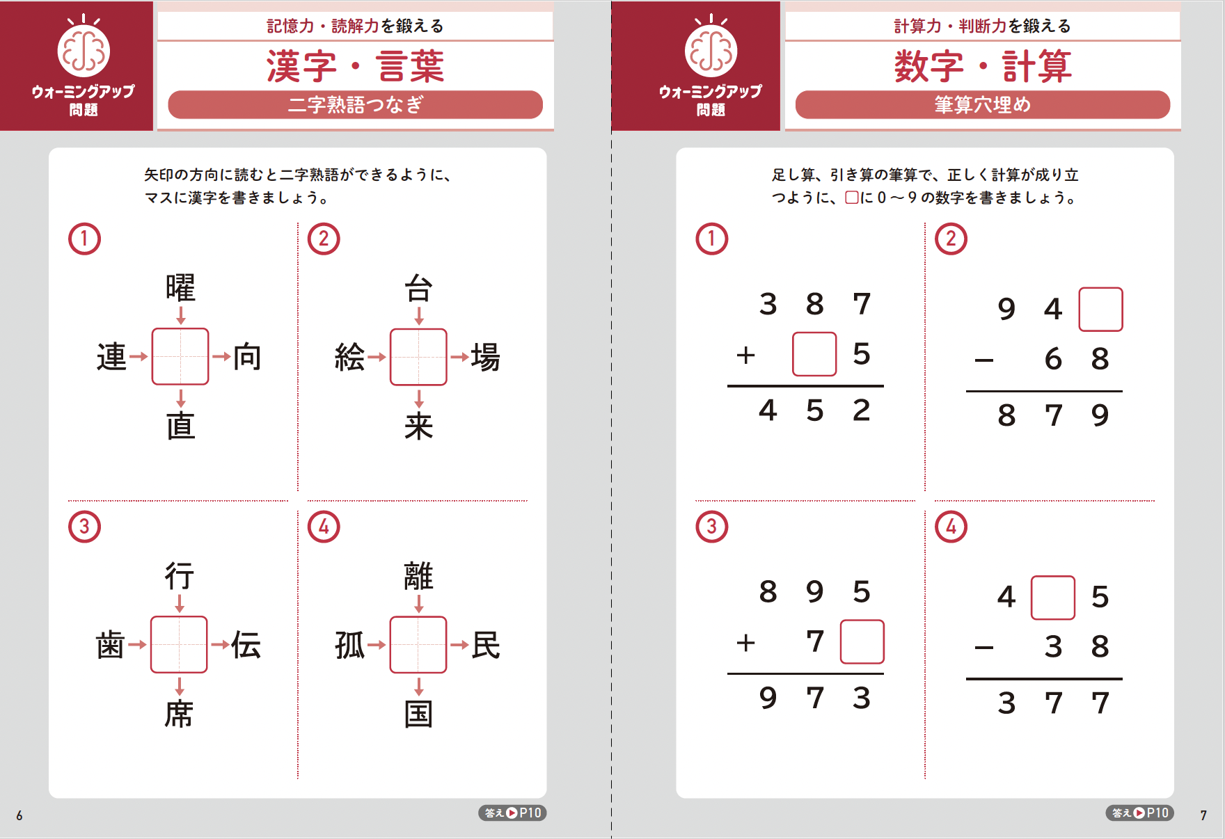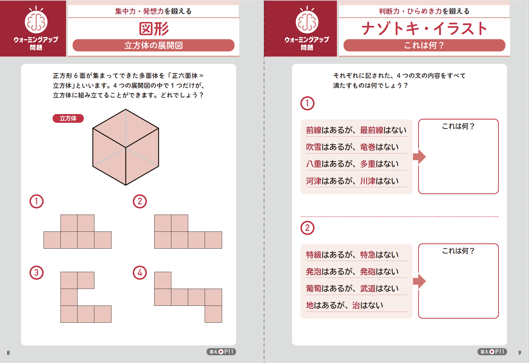 漢字では記憶力、計算では判断力、図形では集中力、ナゾトキ・イラストでは発想力──。