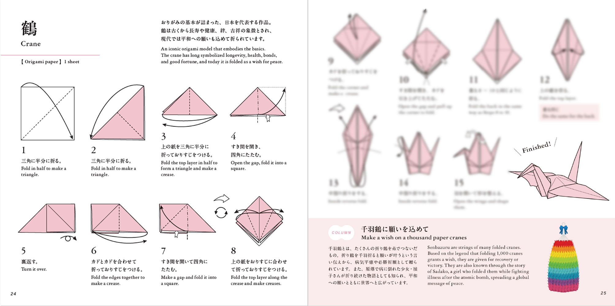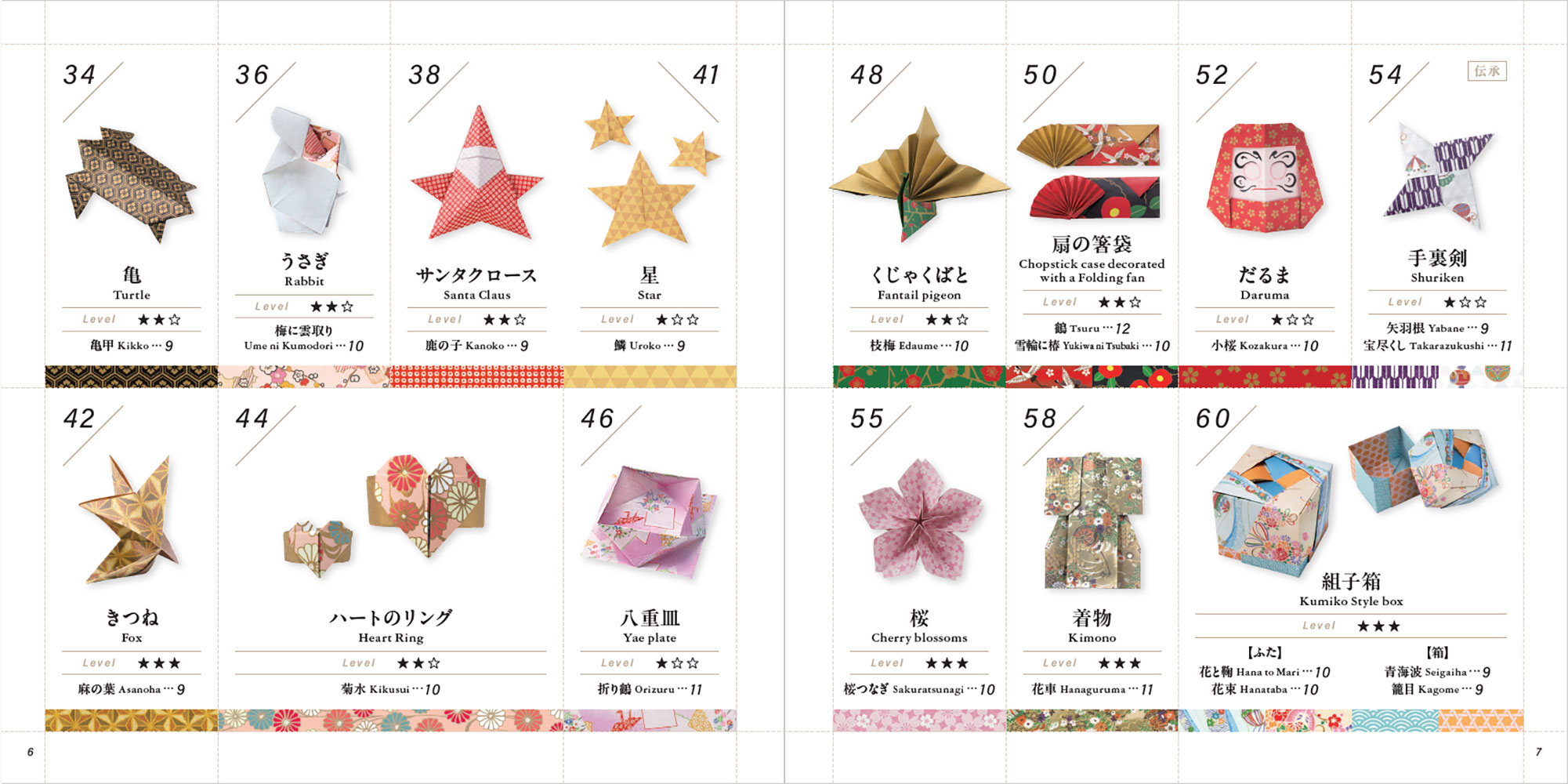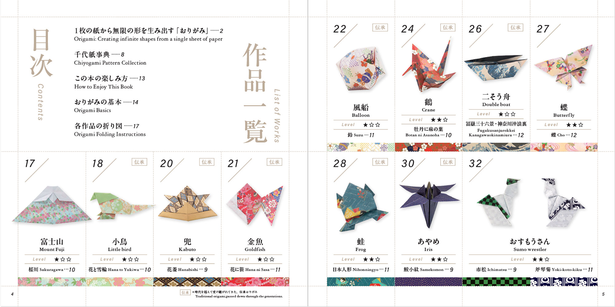 完全バイリンガル: 折り図から作品・文様解説まで英語を併記。